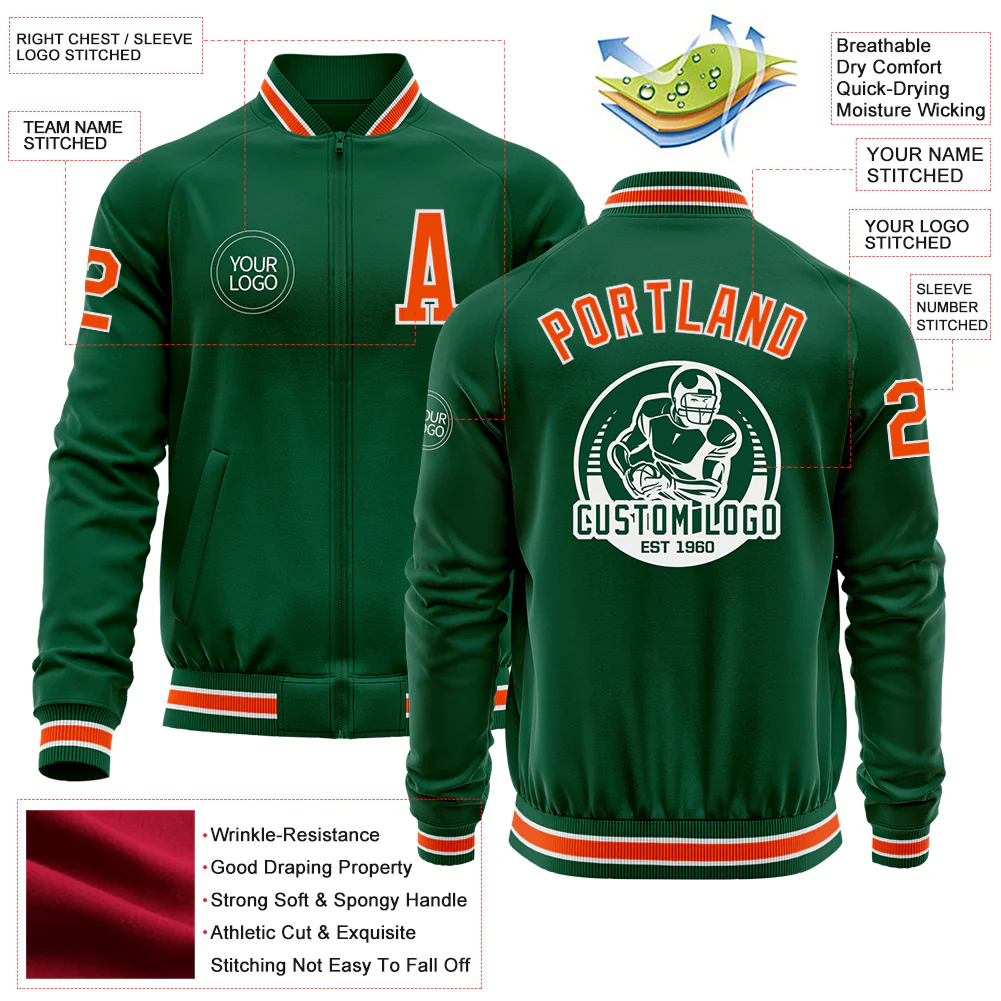 Custom Kelly Green Orange-White Bomber Varsity Letterman Zipper Jacket