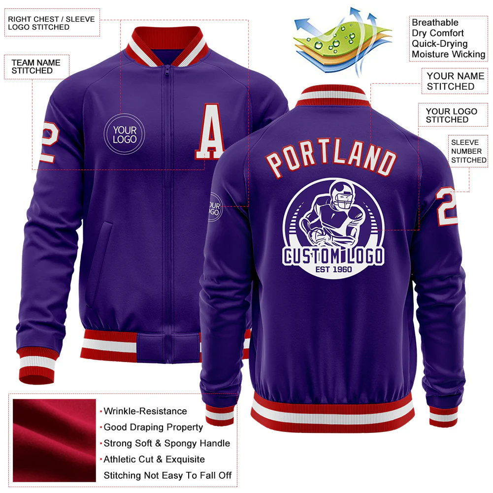 Custom Purple White-Red Bomber Varsity Letterman Zipper Jacket