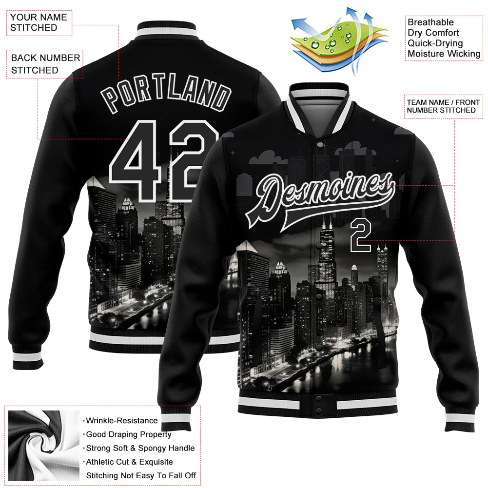 Custom Black White Chicago Illinois City Edition 3D Bomber Full-Snap Varsity Letterman Jacket