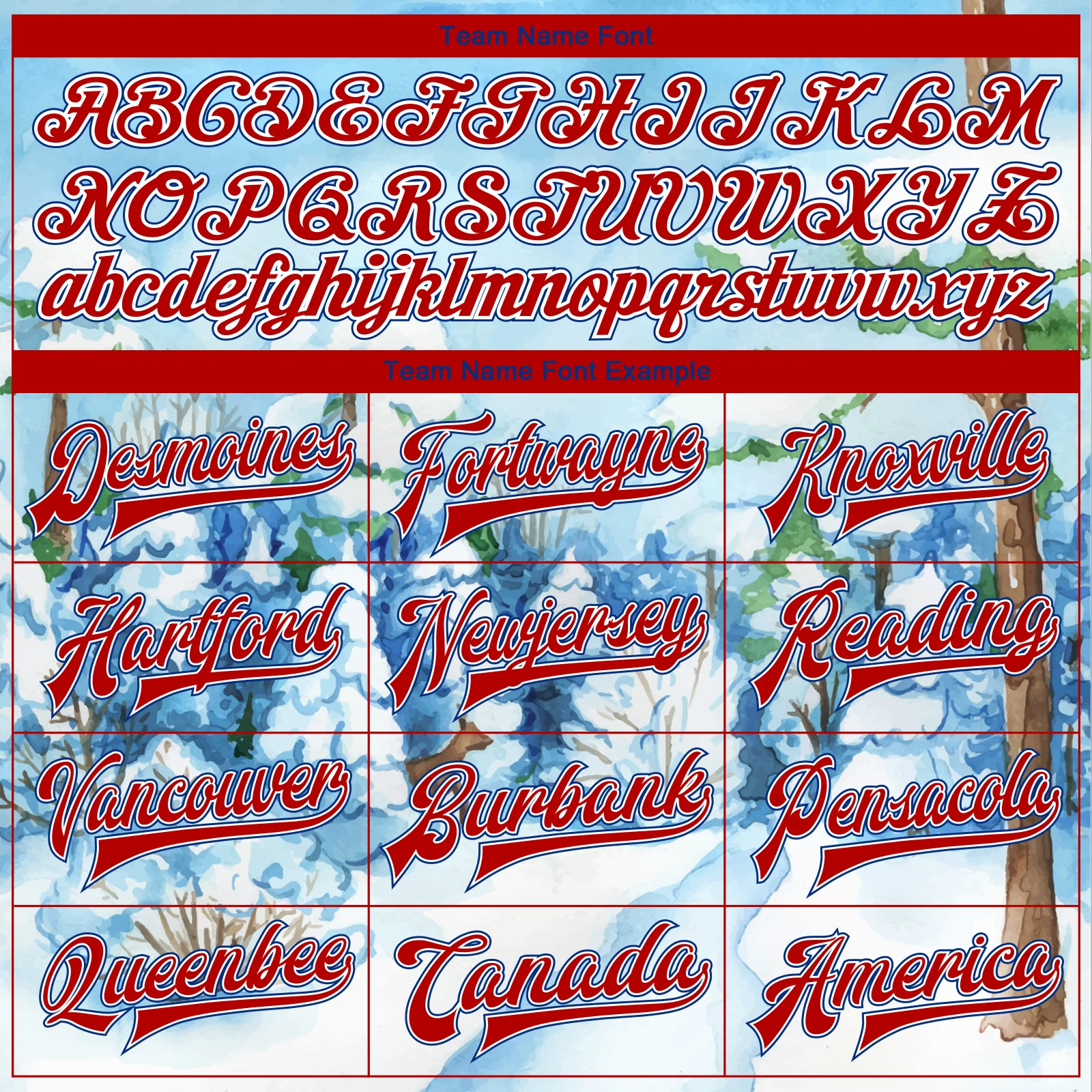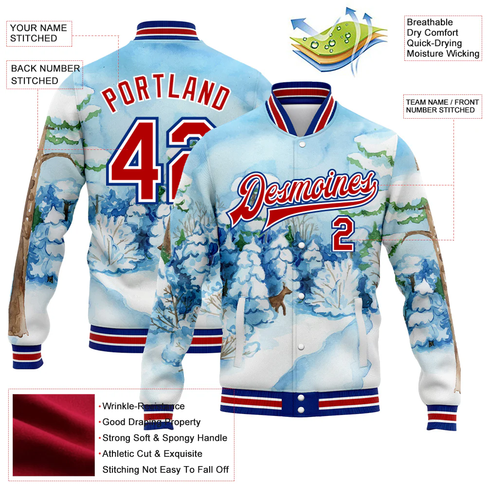 Custom Light Blue Red-Royal Watercolor Winter Landscape With Snowy Trees 3D Pattern Design Bomber Full-Snap Varsity Letterman Jacket