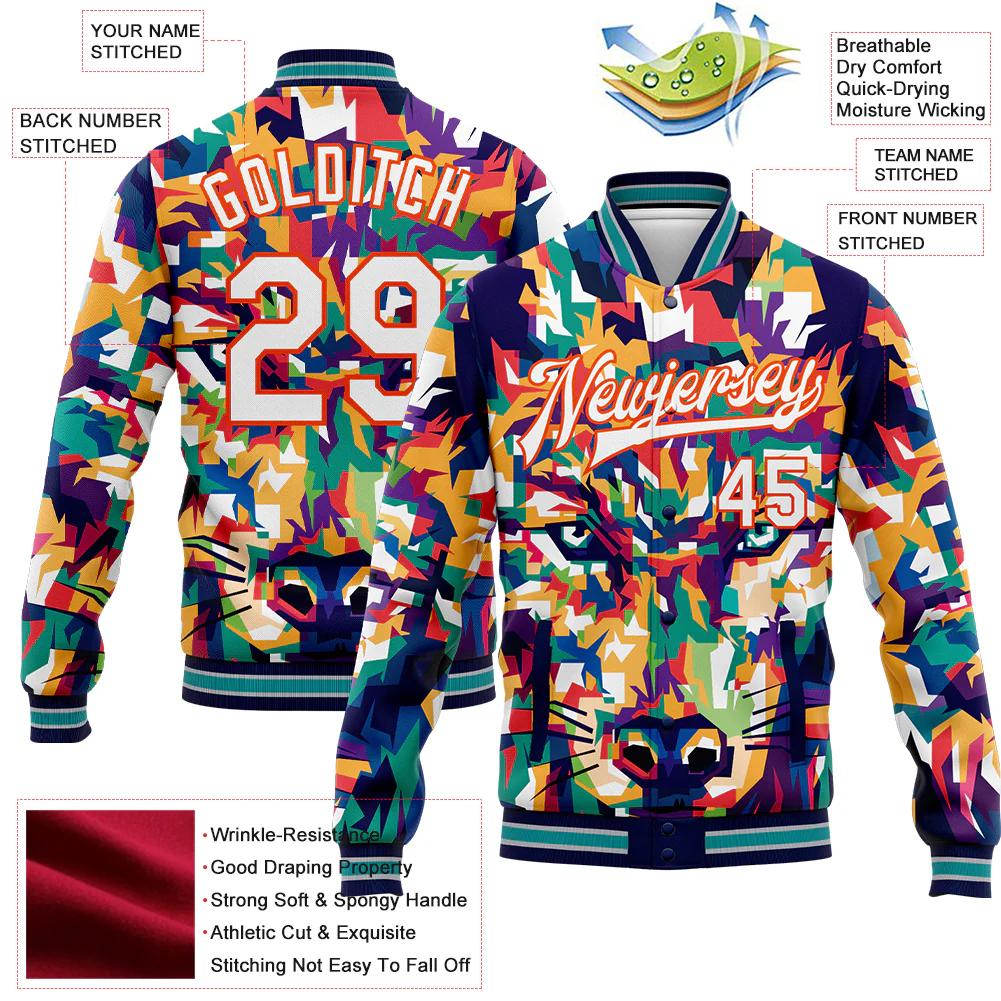 Custom Navy White-Orange Colorful Wolf 3D Pattern Design Bomber Full-Snap Varsity Letterman Jacket