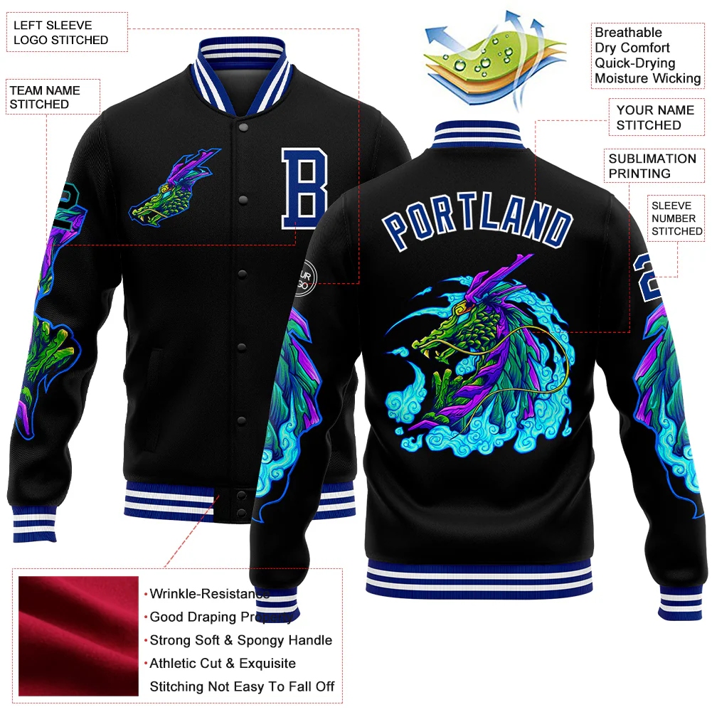 Custom Black Royal-White Dragon 3D Pattern Design Bomber Full-Snap Varsity Letterman Jacket