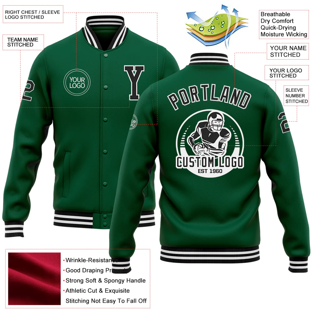 Custom Kelly Green Black-White Bomber Full-Snap Varsity Letterman Jacket