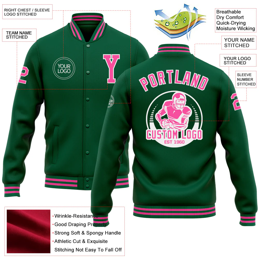 Custom Kelly Green Pink-White Bomber Full-Snap Varsity Letterman Jacket