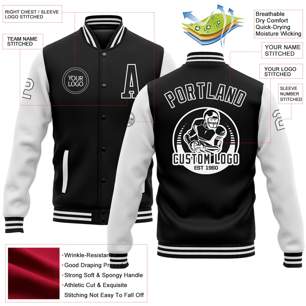 Custom Black White Bomber Full-Snap Varsity Letterman Two Tone Jacket