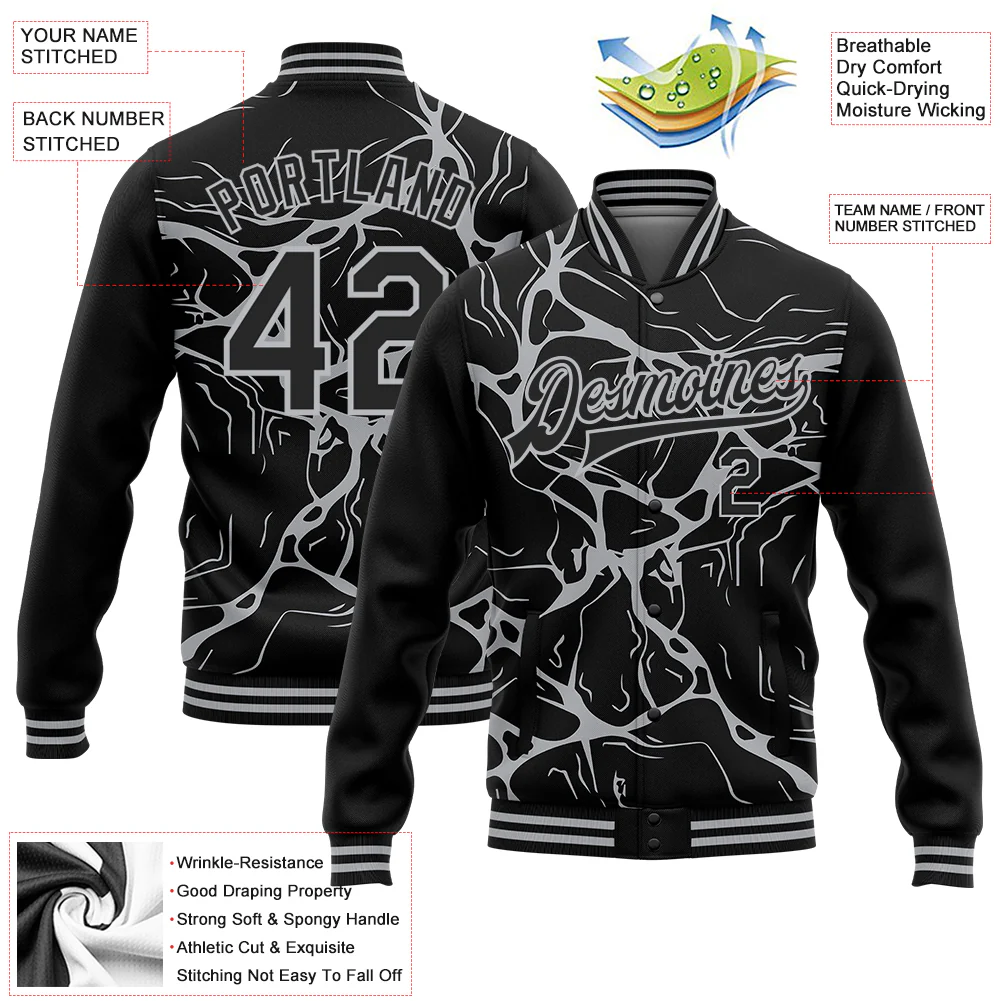 Custom Black Gray Abstract Network 3D Pattern Design Bomber Full-Snap Varsity Letterman Jacket