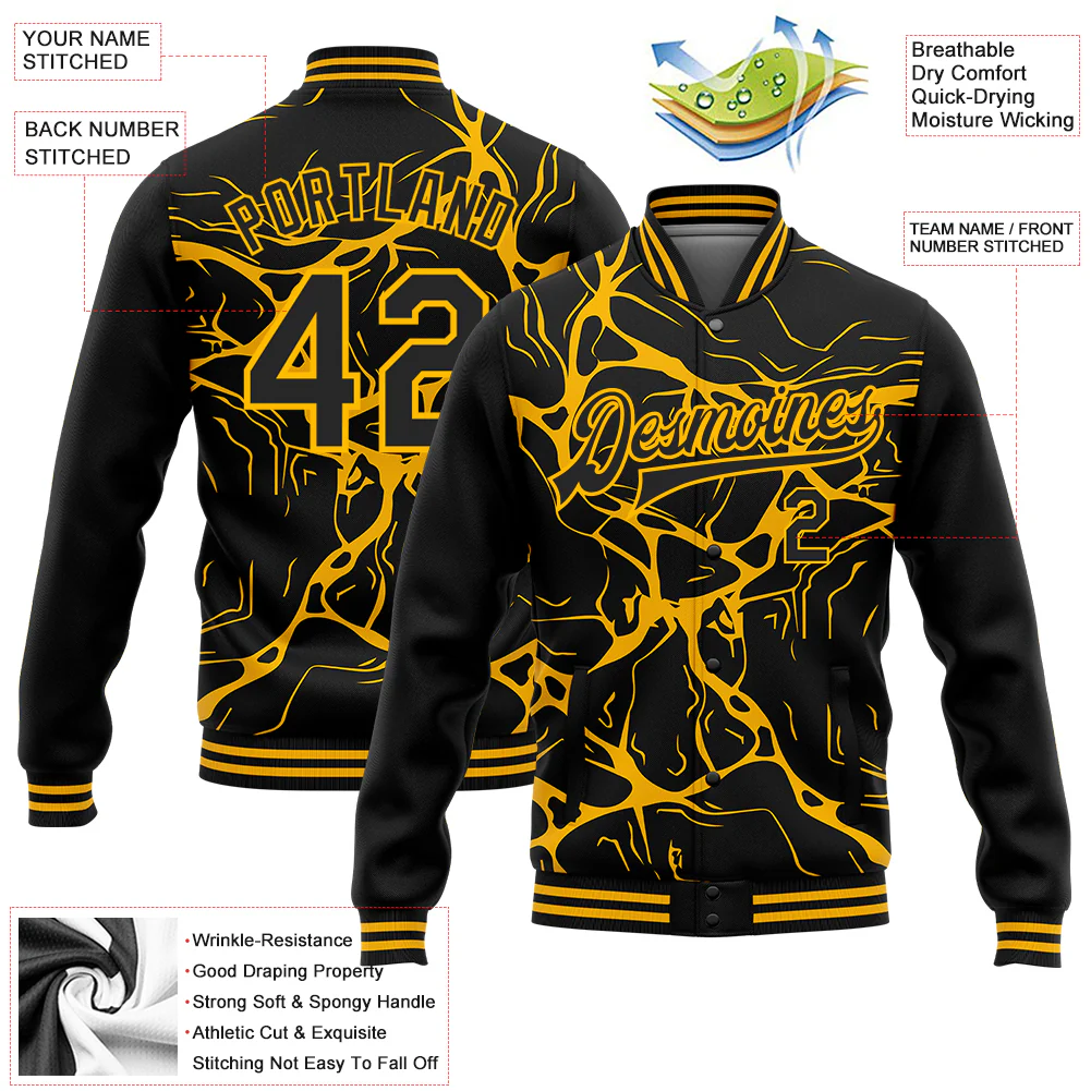 Custom Black Gold Abstract Network 3D Pattern Design Bomber Full-Snap Varsity Letterman Jacket