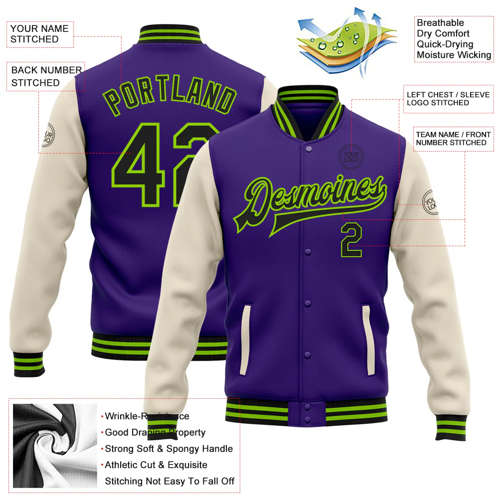 Custom Purple Black Cream-Neon Green Bomber Full-Snap Varsity Letterman Two Tone Jacket