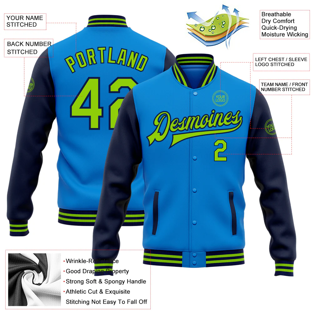 Custom Powder Blue Neon Green-Navy Bomber Full-Snap Varsity Letterman Two Tone Jacket