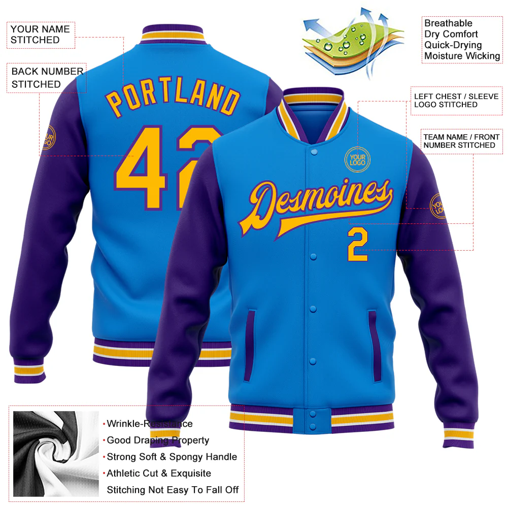 Custom Powder Blue Gold-Purple Bomber Full-Snap Varsity Letterman Two Tone Jacket