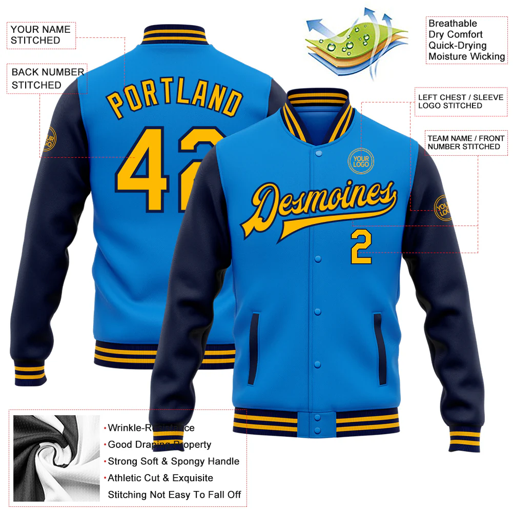 Custom Powder Blue Gold-Navy Bomber Full-Snap Varsity Letterman Two Tone Jacket
