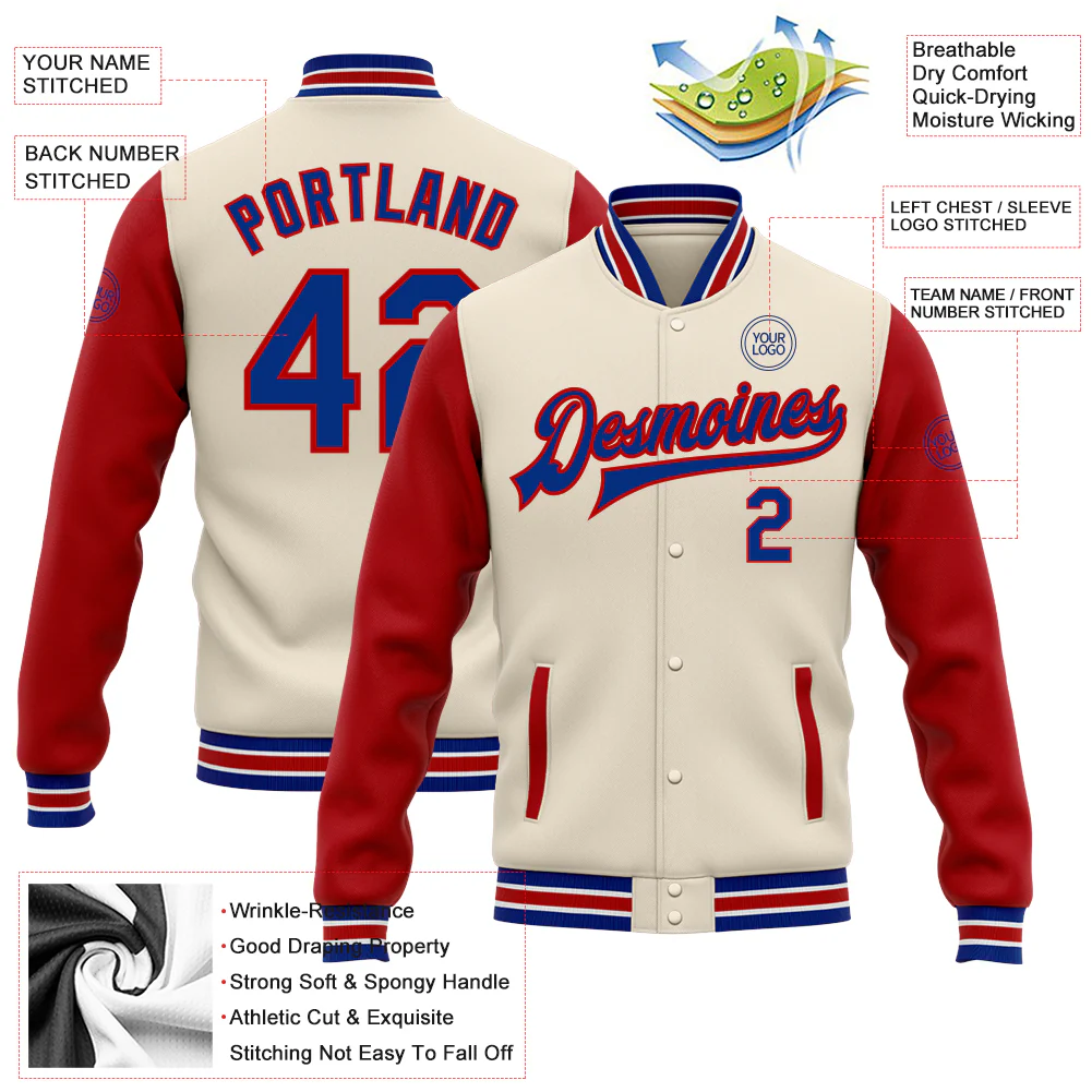 Custom Cream Royal-Red Bomber Full-Snap Varsity Letterman Two Tone Jacket