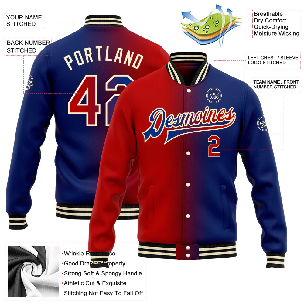 Custom Royal Red-Cream Bomber Full-Snap Varsity Letterman Gradient Fashion Jacket