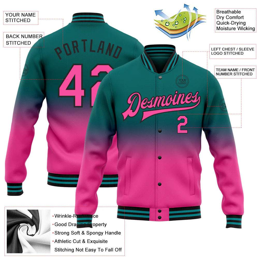 Custom Teal Pink-Black Bomber Full-Snap Varsity Letterman Fade Fashion Jacket