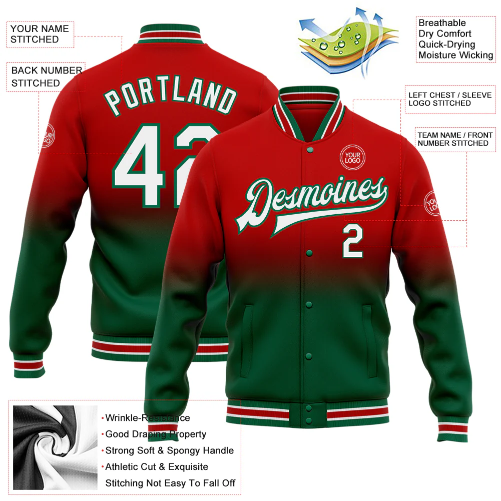 Custom Red White-Kelly Green Bomber Full-Snap Varsity Letterman Fade Fashion Jacket