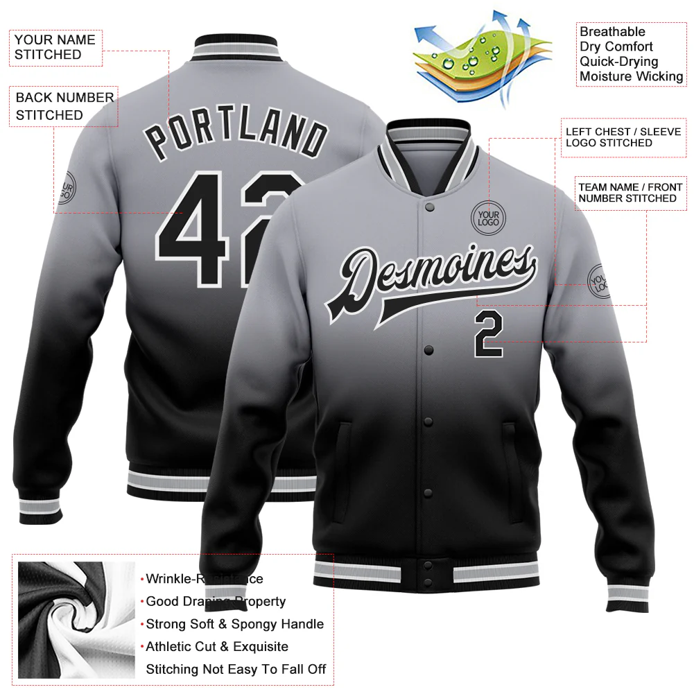 Custom Gray Black-White Bomber Full-Snap Varsity Letterman Fade Fashion Jacket