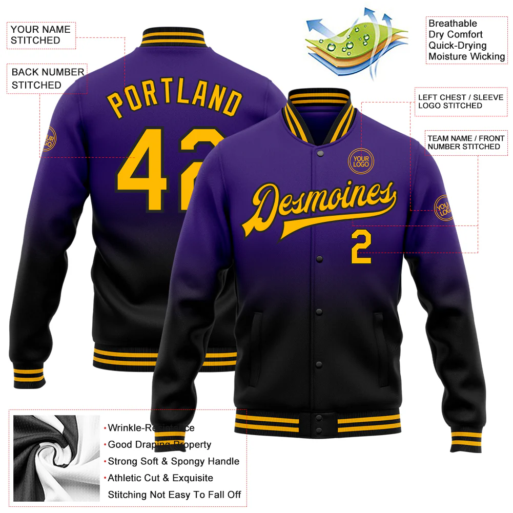 Custom Purple Gold-Black Bomber Full-Snap Varsity Letterman Fade Fashion Jacket