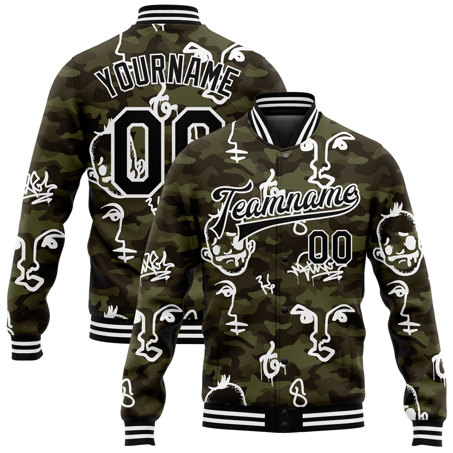 Custom Camo Black-White Hand Painted Face 3D Pattern Design Bomber Full-Snap Varsity Letterman Salute To Service Jacket