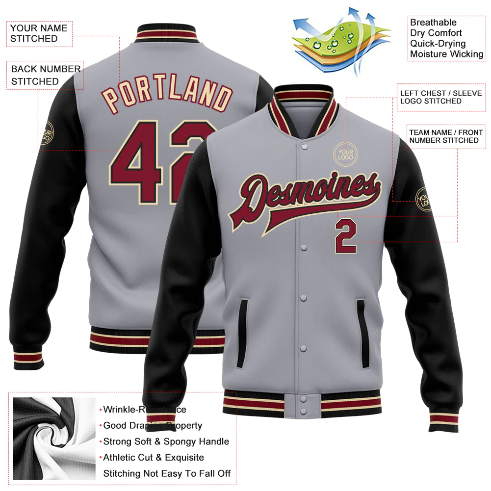 Custom Gray Crimson Black-City Cream Bomber Full-Snap Varsity Letterman Two Tone Jacket
