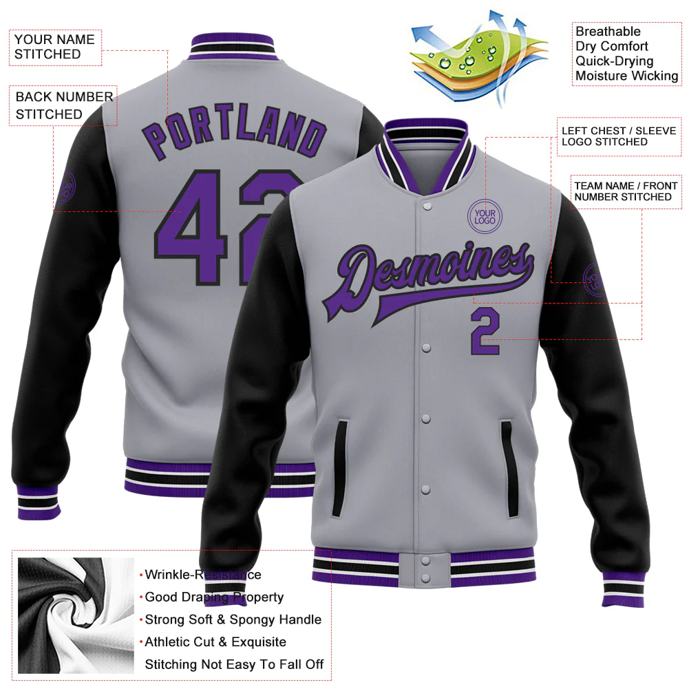 Custom Gray Purple-Black Bomber Full-Snap Varsity Letterman Two Tone Jacket
