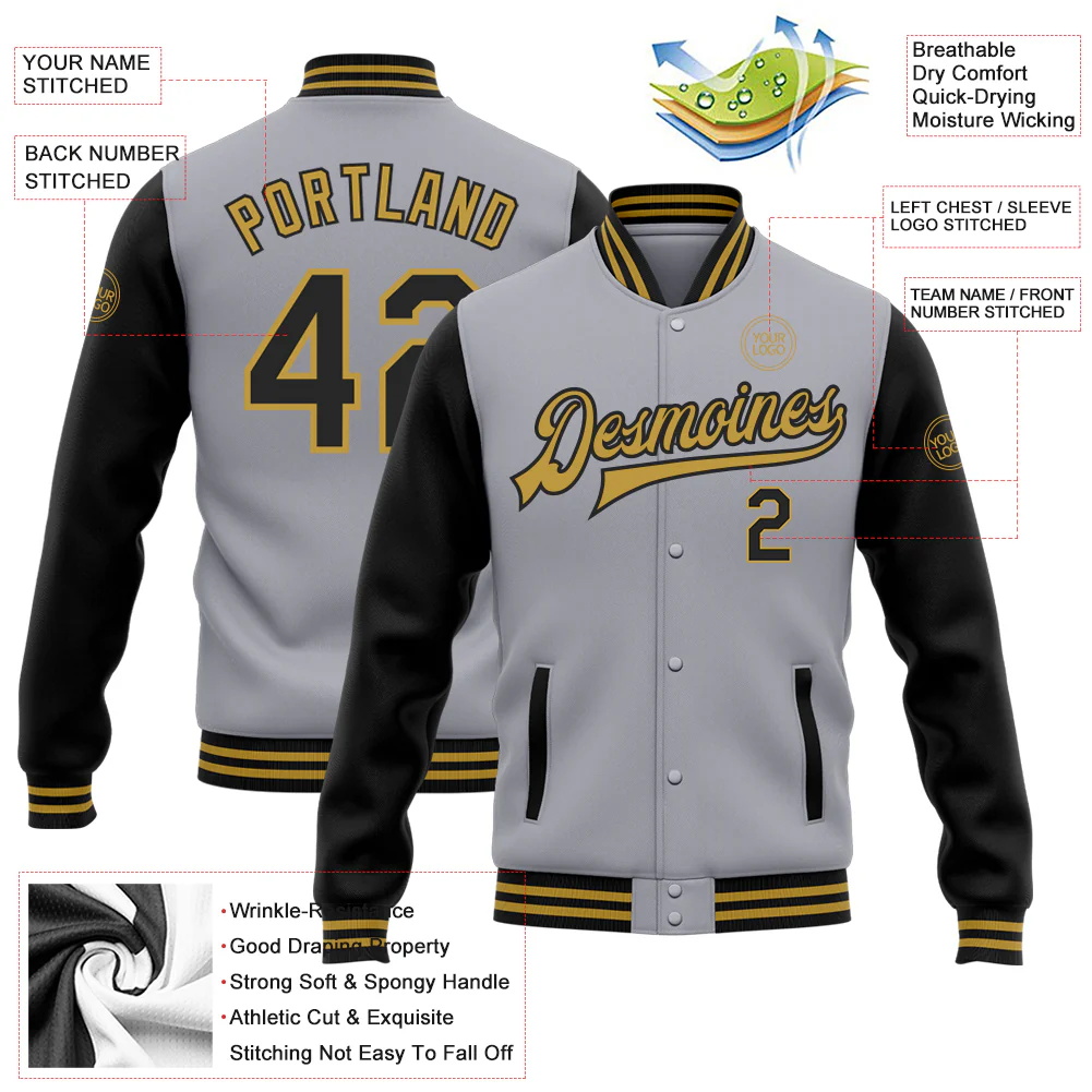 Custom Gray Black-Gold Bomber Full-Snap Varsity Letterman Two Tone Jacket