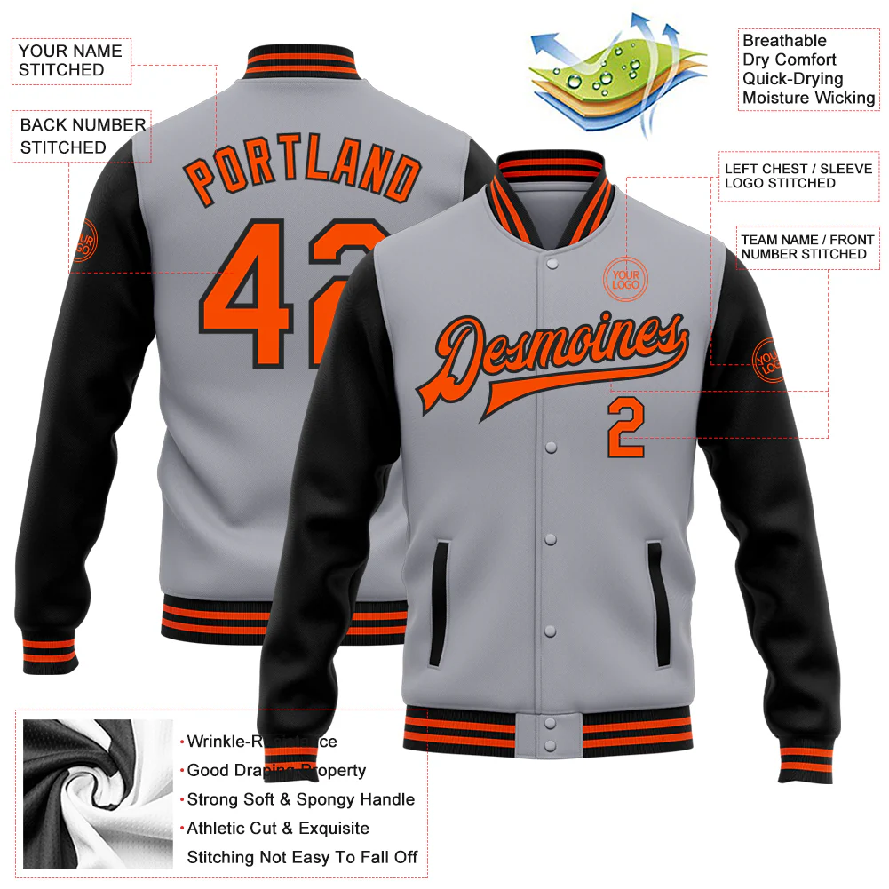 Custom Gray Orange-Black Bomber Full-Snap Varsity Letterman Two Tone Jacket