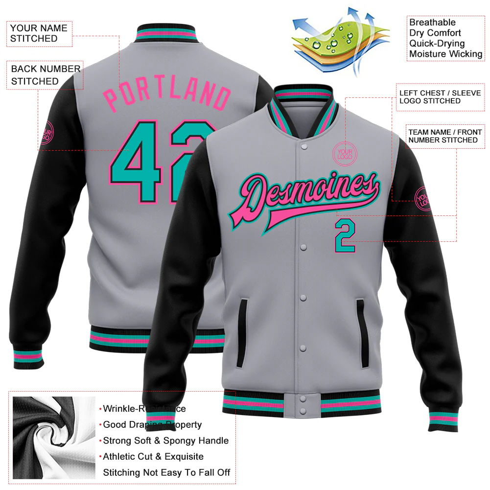 Custom Gray Aqua Black-Pink Bomber Full-Snap Varsity Letterman Two Tone Jacket