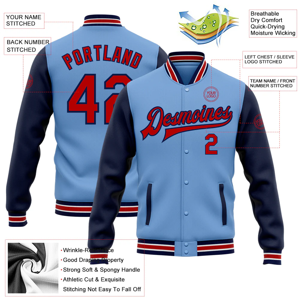 Custom Light Blue Red-Navy Bomber Full-Snap Varsity Letterman Two Tone Jacket