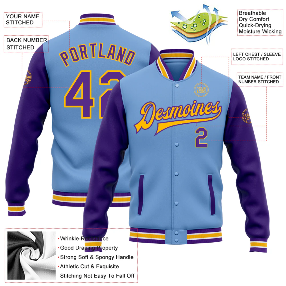 Custom Light Blue Purple-Gold Bomber Full-Snap Varsity Letterman Two Tone Jacket