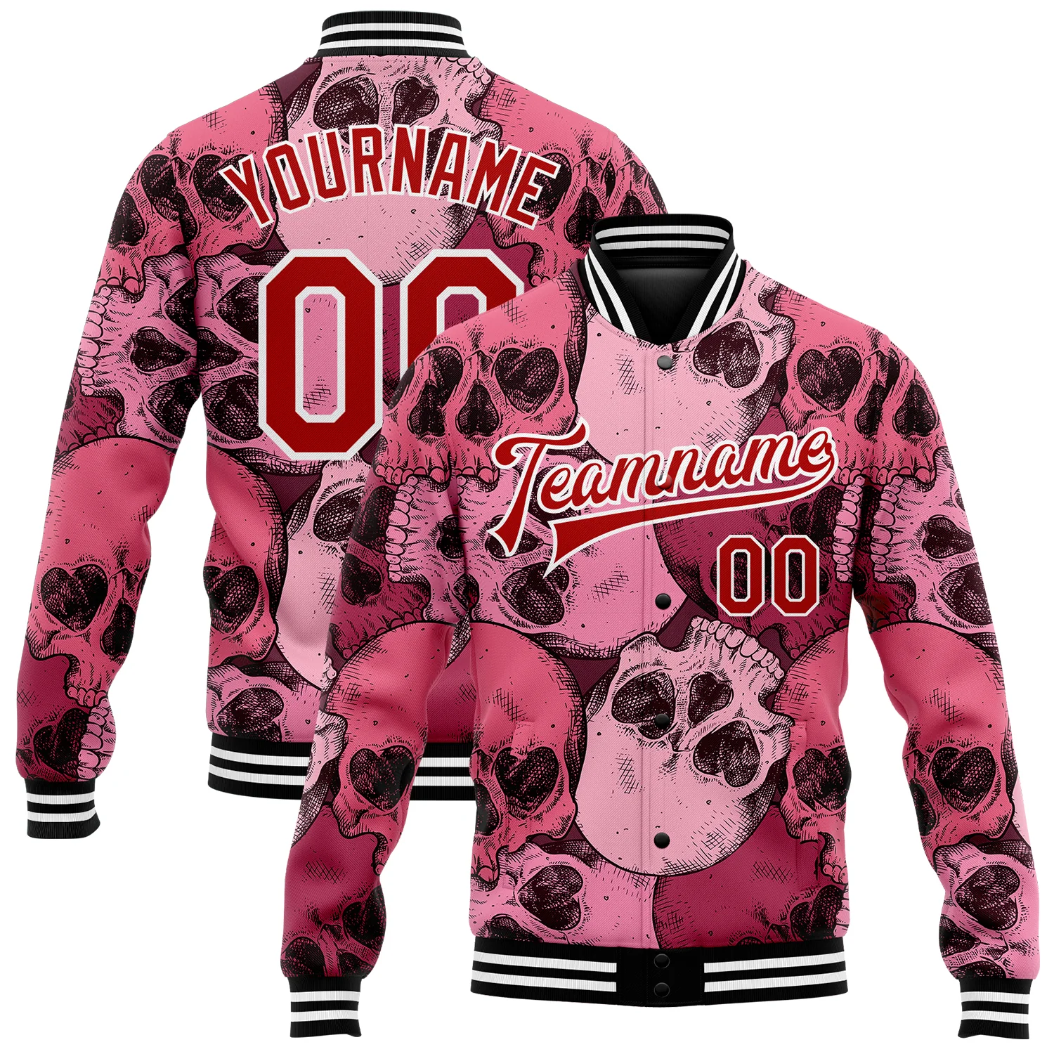 Custom Pink Red-White Skull With Heart Shaped Eyes 3D Bomber Full-Snap Varsity Letterman Jacket