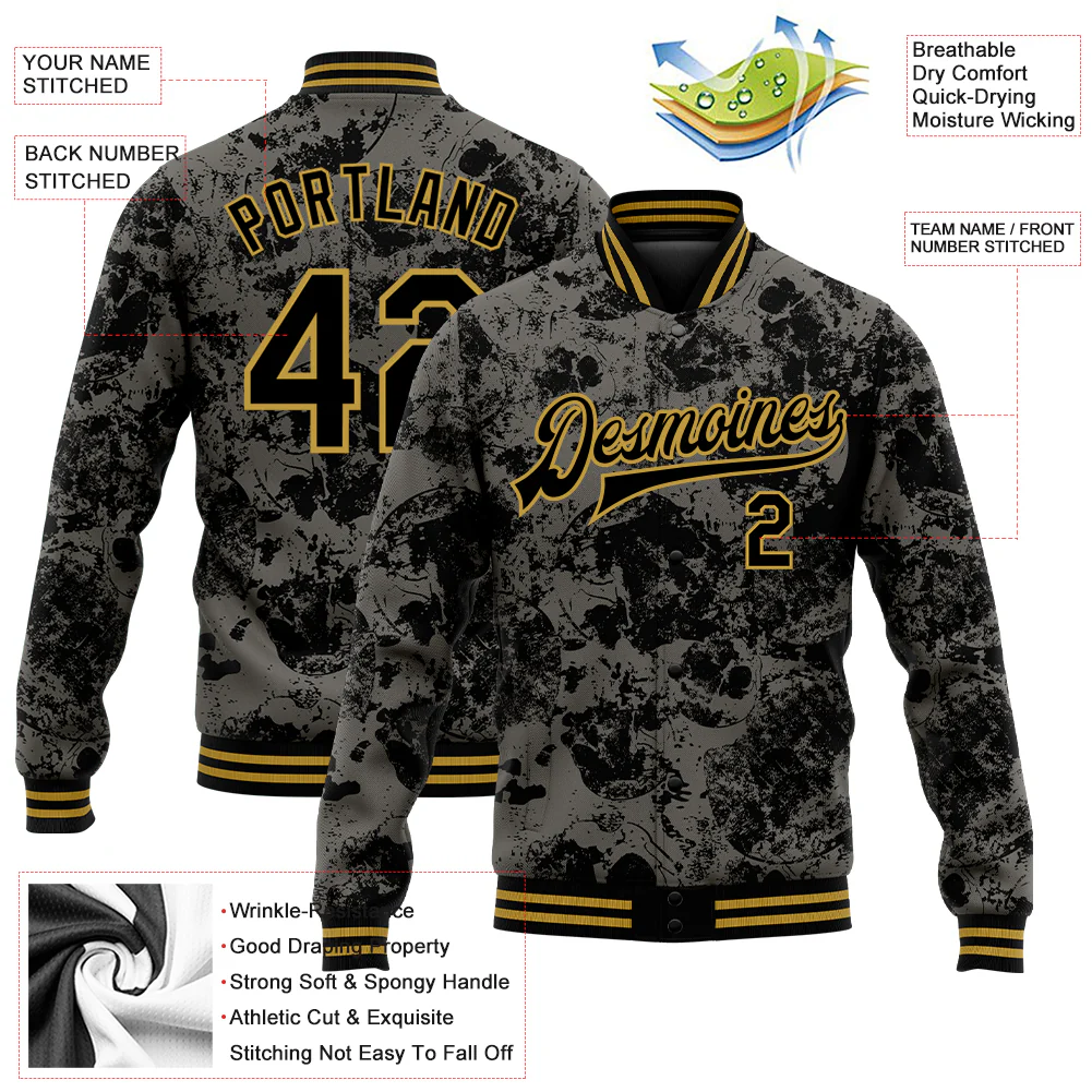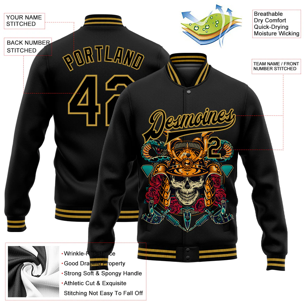 Custom Black Old Gold Skull Fashion 3D Bomber Full-Snap Varsity Letterman Jacket