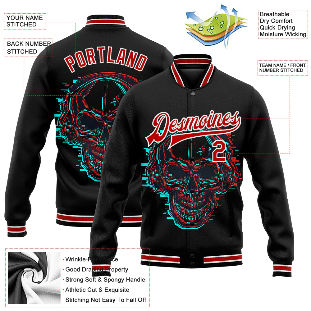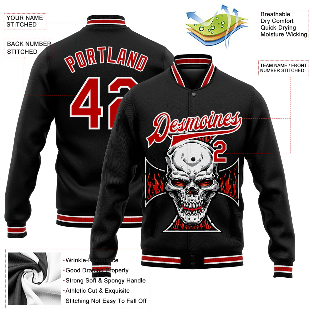 Custom Black Red-White Skull With Cross Logo 3D Bomber Full-Snap Varsity Letterman Jacket