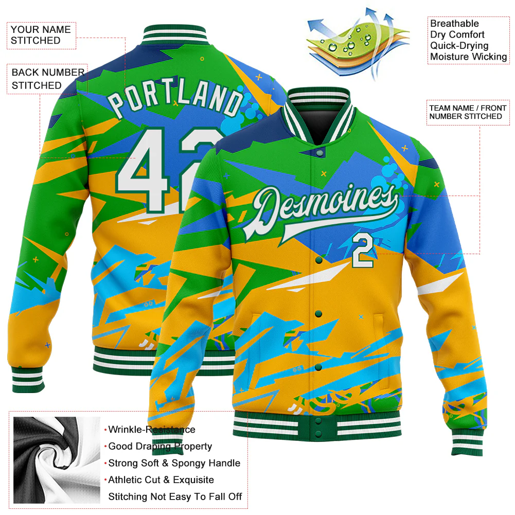 Custom Graffiti Pattern White-Kelly Green Hiphop Abstract Urban Street Art 3D Bomber Full-Snap Varsity Letterman Jacket