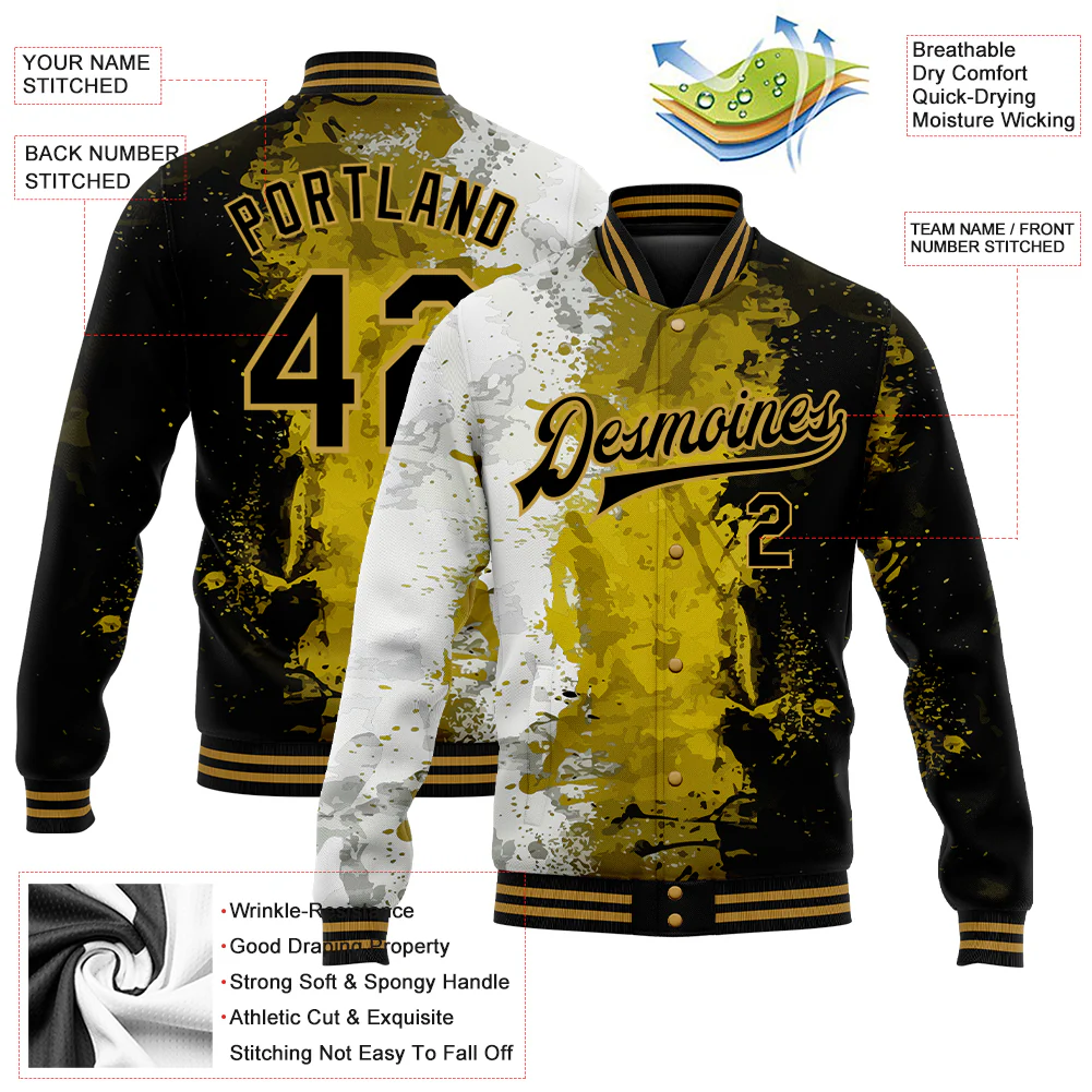 Custom Graffiti Pattern Black-Old Gold Grunge Art 3D Bomber Full-Snap Varsity Letterman Jacket