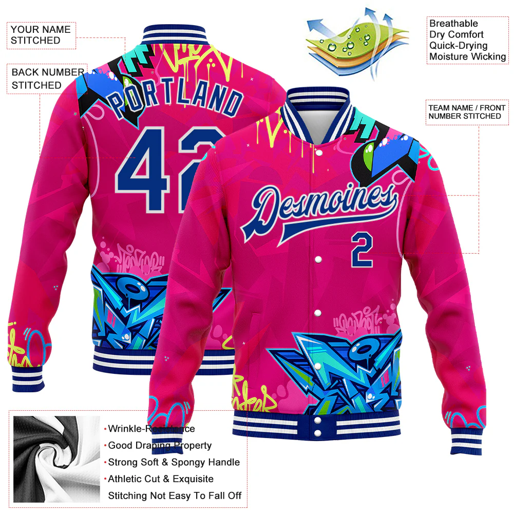 Custom Graffiti Pattern Pink-Black Hiphop Abstract Urban Street Art 3D Bomber Full-Snap Varsity Letterman Jacket
