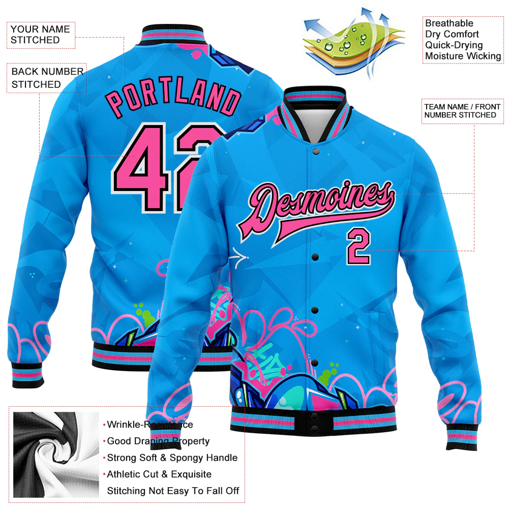 Custom Graffiti Pattern Pink-Light Blue Abstract Grunge Art 3D Bomber Full-Snap Varsity Letterman Jacket