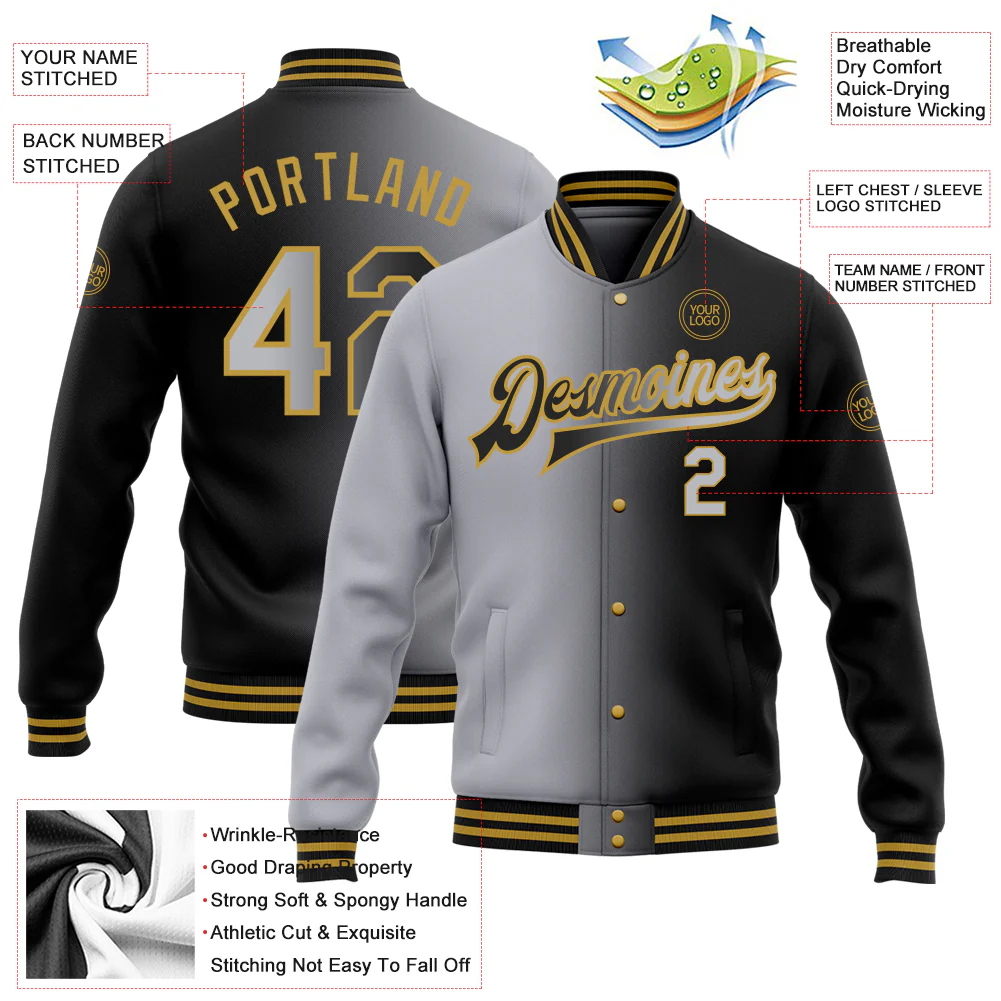 Custom Black Gray-Old Gold Bomber Full-Snap Varsity Letterman Gradient Fashion Jacket