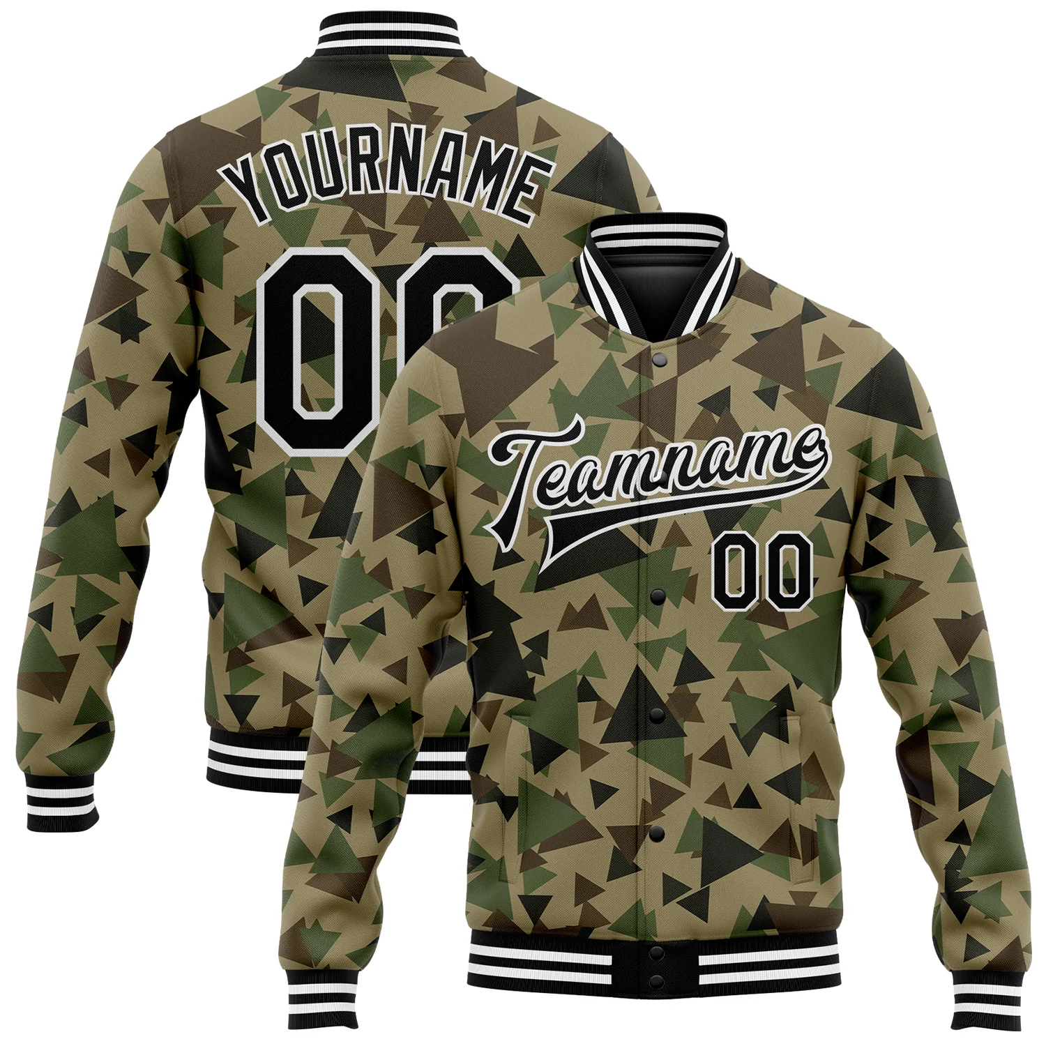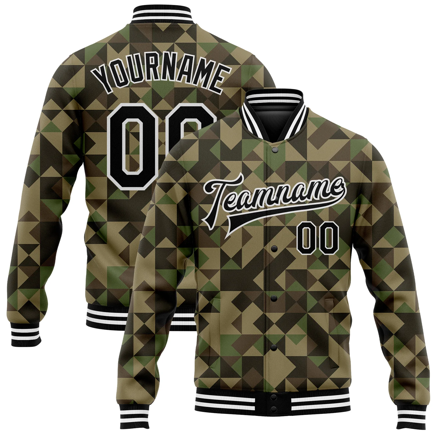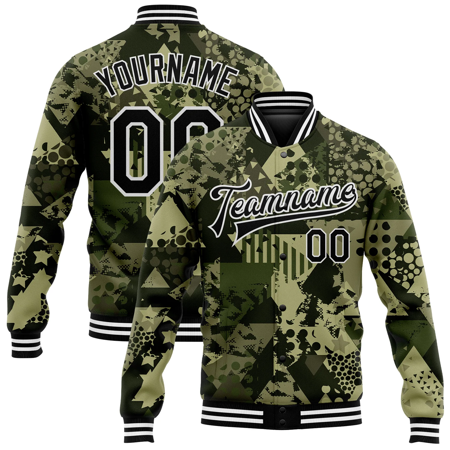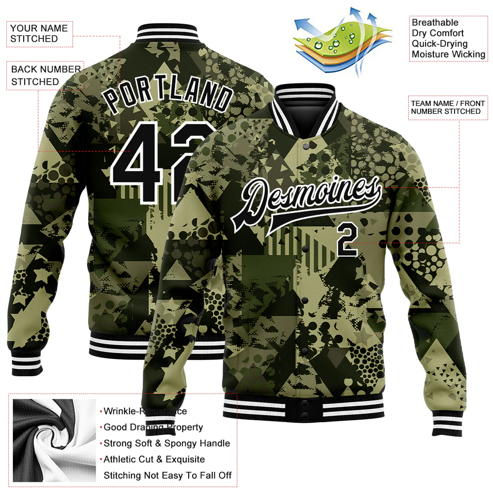 Custom Camo Black-White Geometric Camouflage 3D Bomber Full-Snap Varsity Letterman Salute To Service Jacket