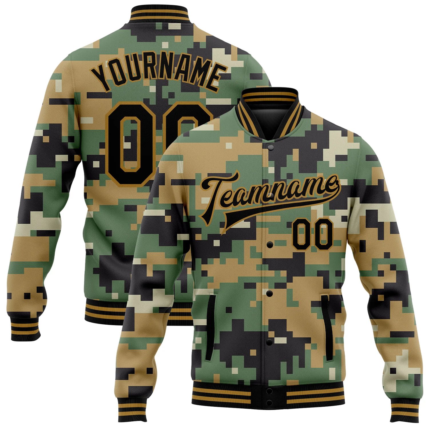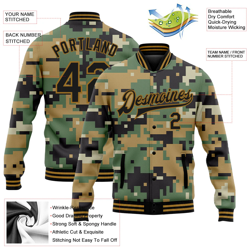 Custom Camo Old Gold-Black Digital Camouflage 3D Bomber Full-Snap Varsity Letterman Salute To Service Jacket