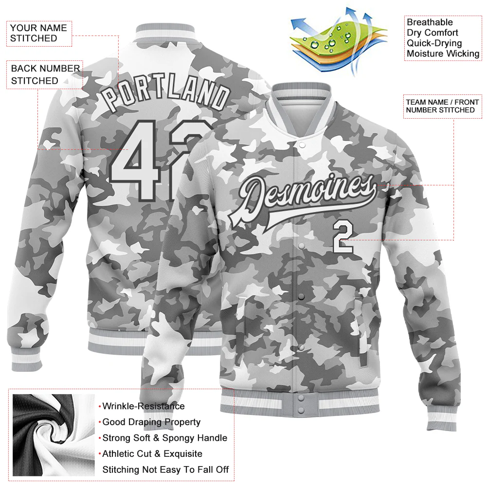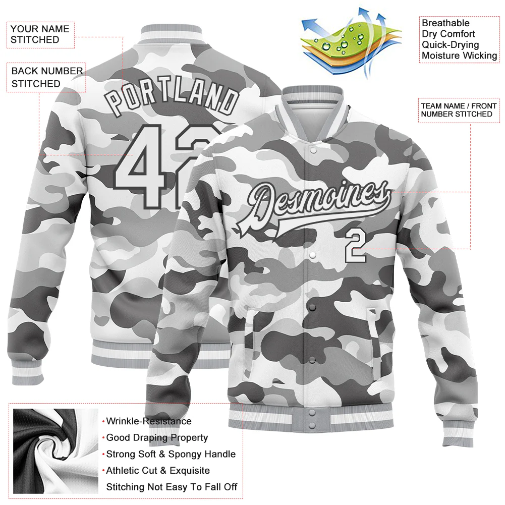 Custom Camo White-Steel Gray Snow Camouflage 3D Bomber Full-Snap Varsity Letterman Salute To Service Jacket