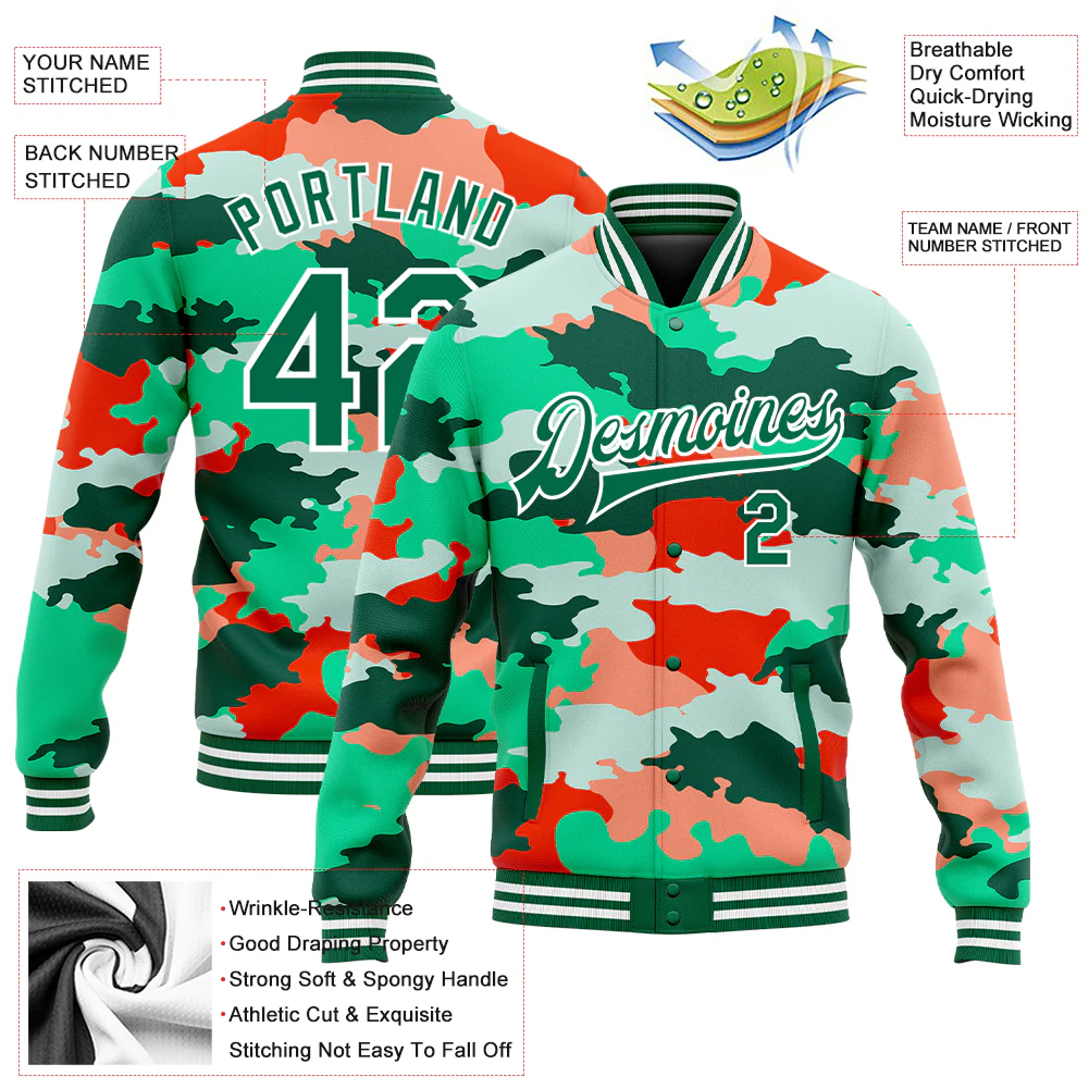 Custom Camo Kelly Green-White Fluorescent Camouflage 3D Bomber Full-Snap Varsity Letterman Salute To Service Jacket