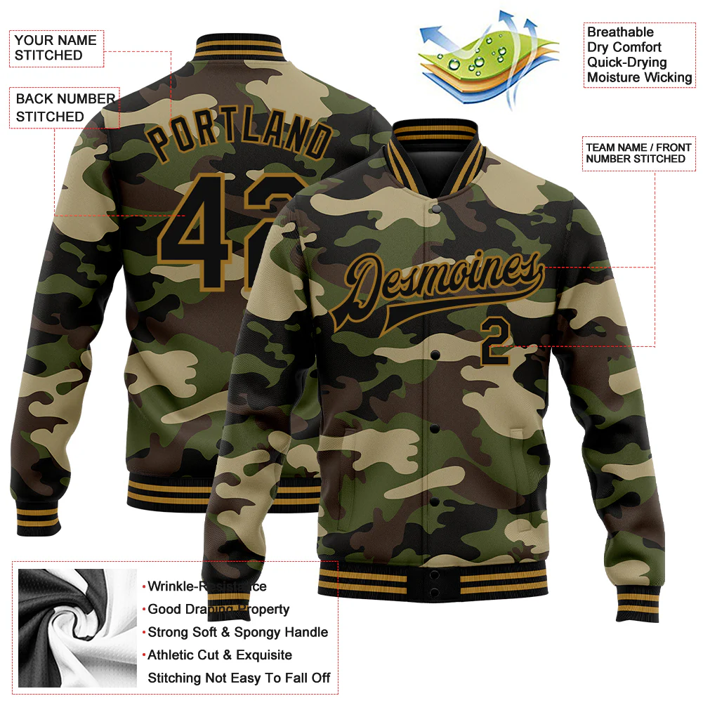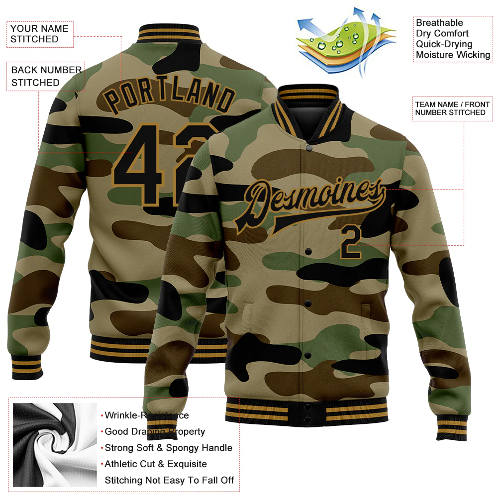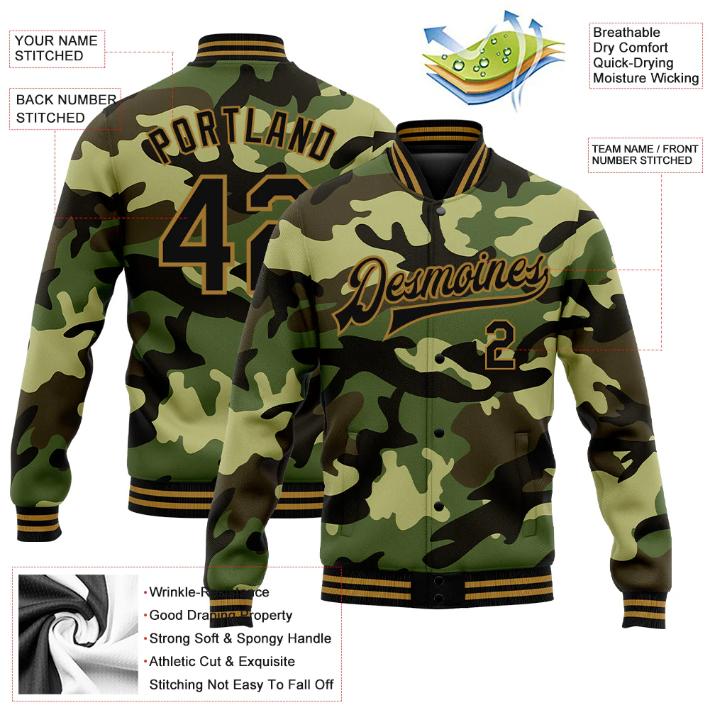 Custom Camo Black-Old Gold Jungle Camouflage 3D Bomber Full-Snap Varsity Letterman Salute To Service Jacket