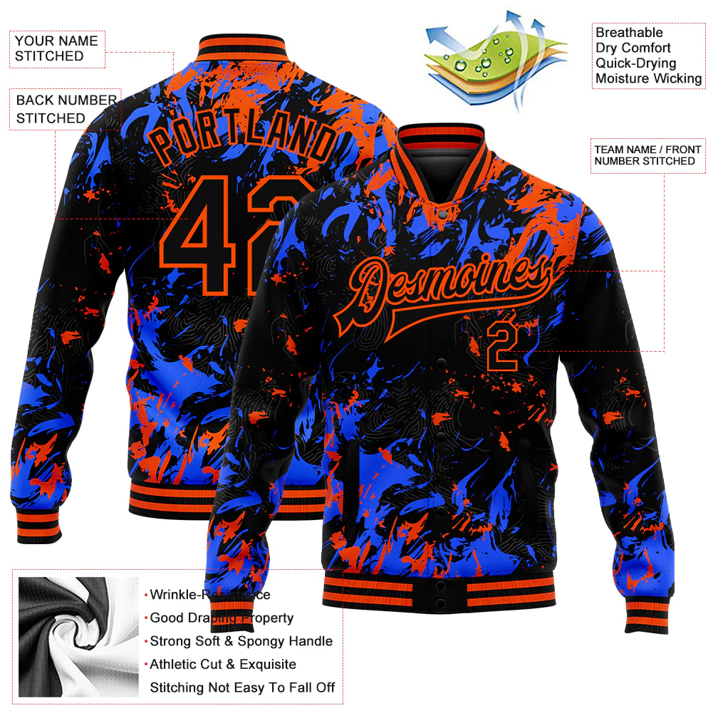 Custom Black Orange-Royal 3D Pattern Design Bomber Full-Snap Varsity Letterman Jacket