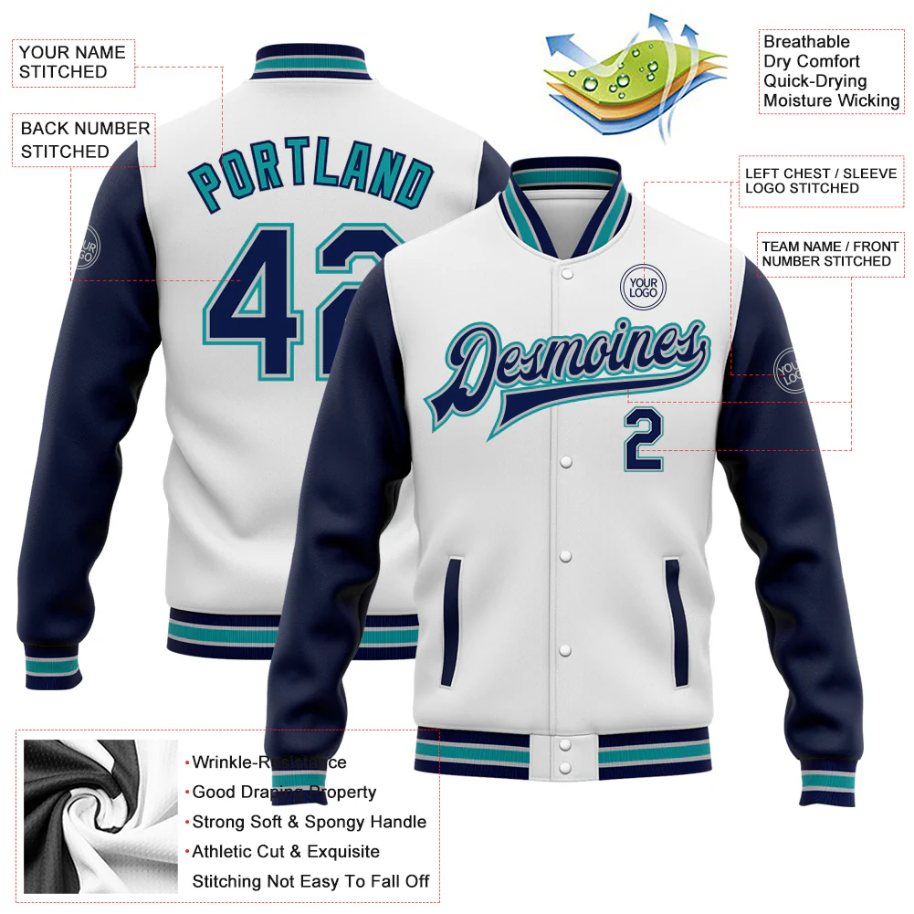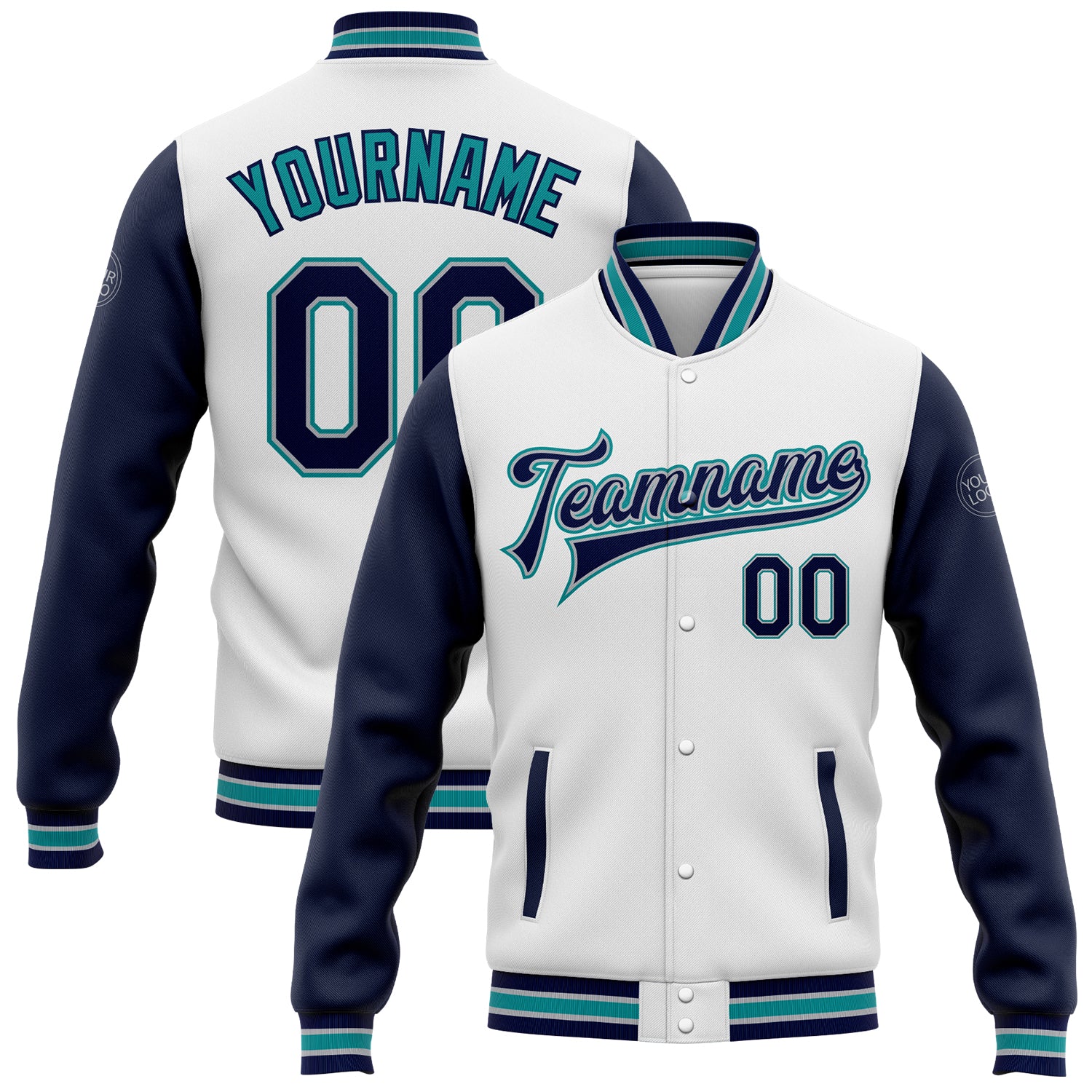 Custom White Navy Gray-Teal Bomber Full-Snap Varsity Letterman Two Tone Jacket