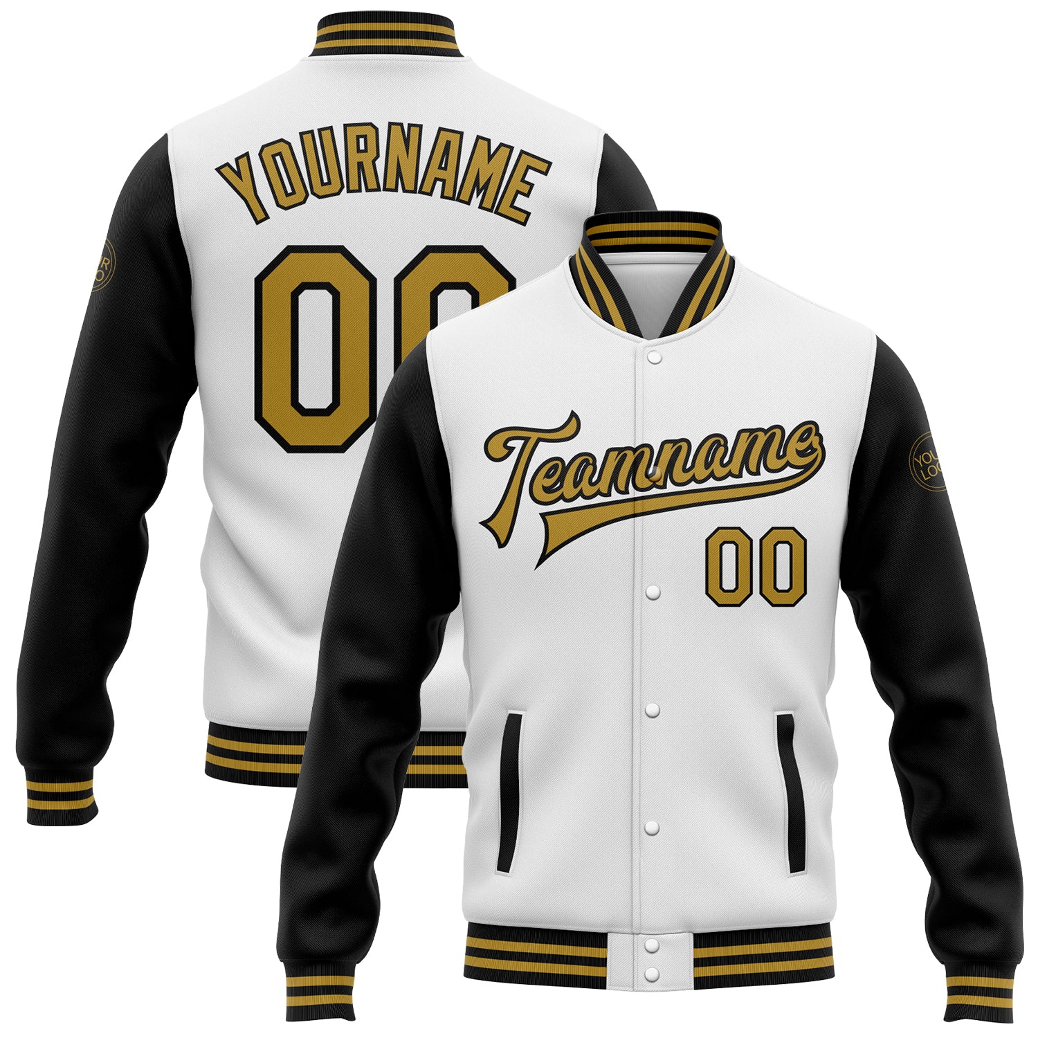 Custom White Old Gold-Black Bomber Full-Snap Varsity Letterman Two Tone Jacket