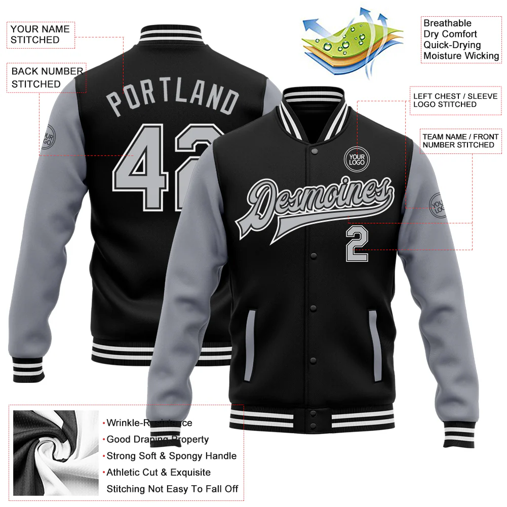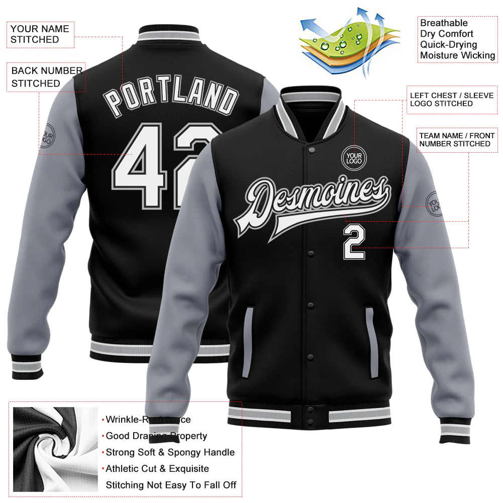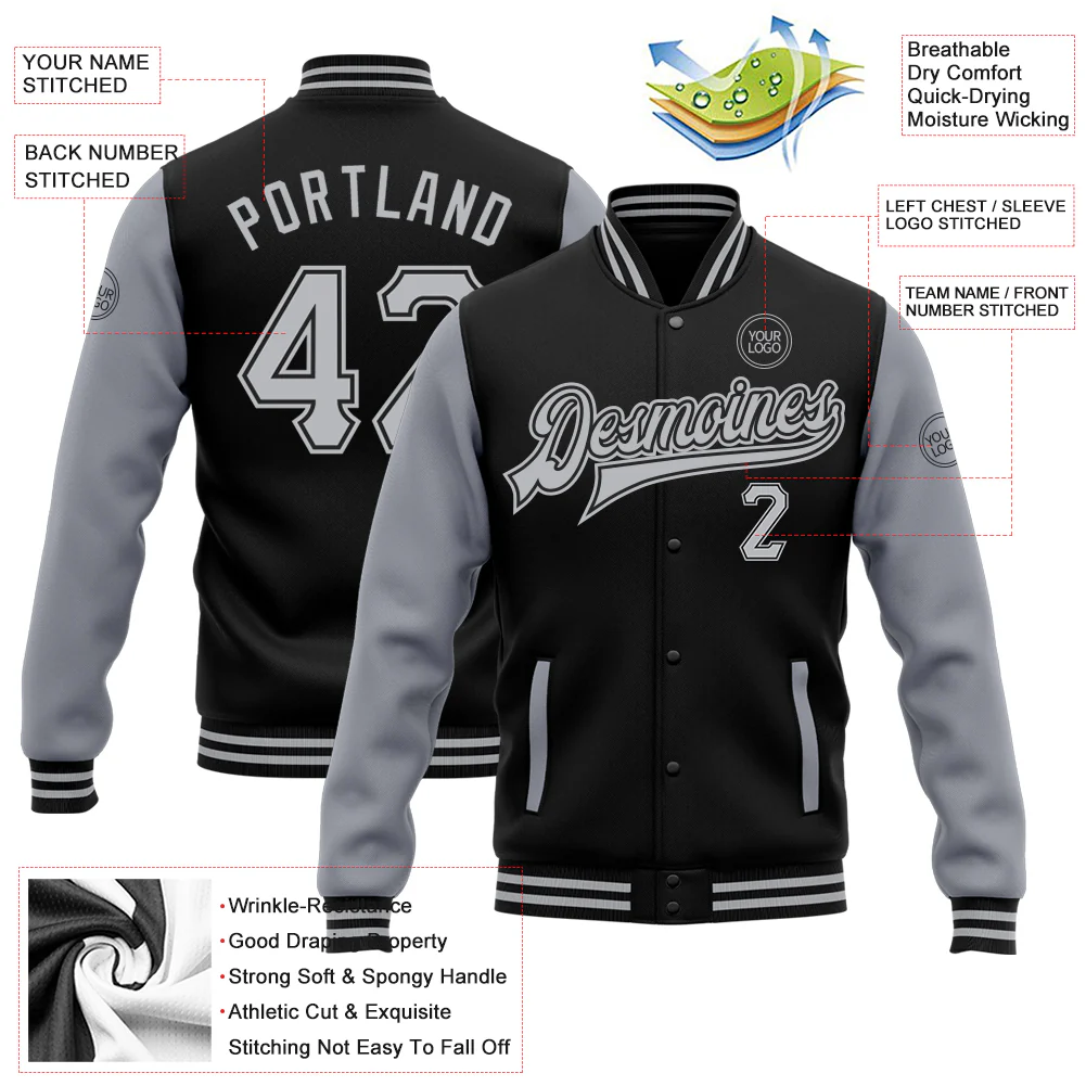 Custom Black Gray Bomber Full-Snap Varsity Letterman Two Tone Jacket