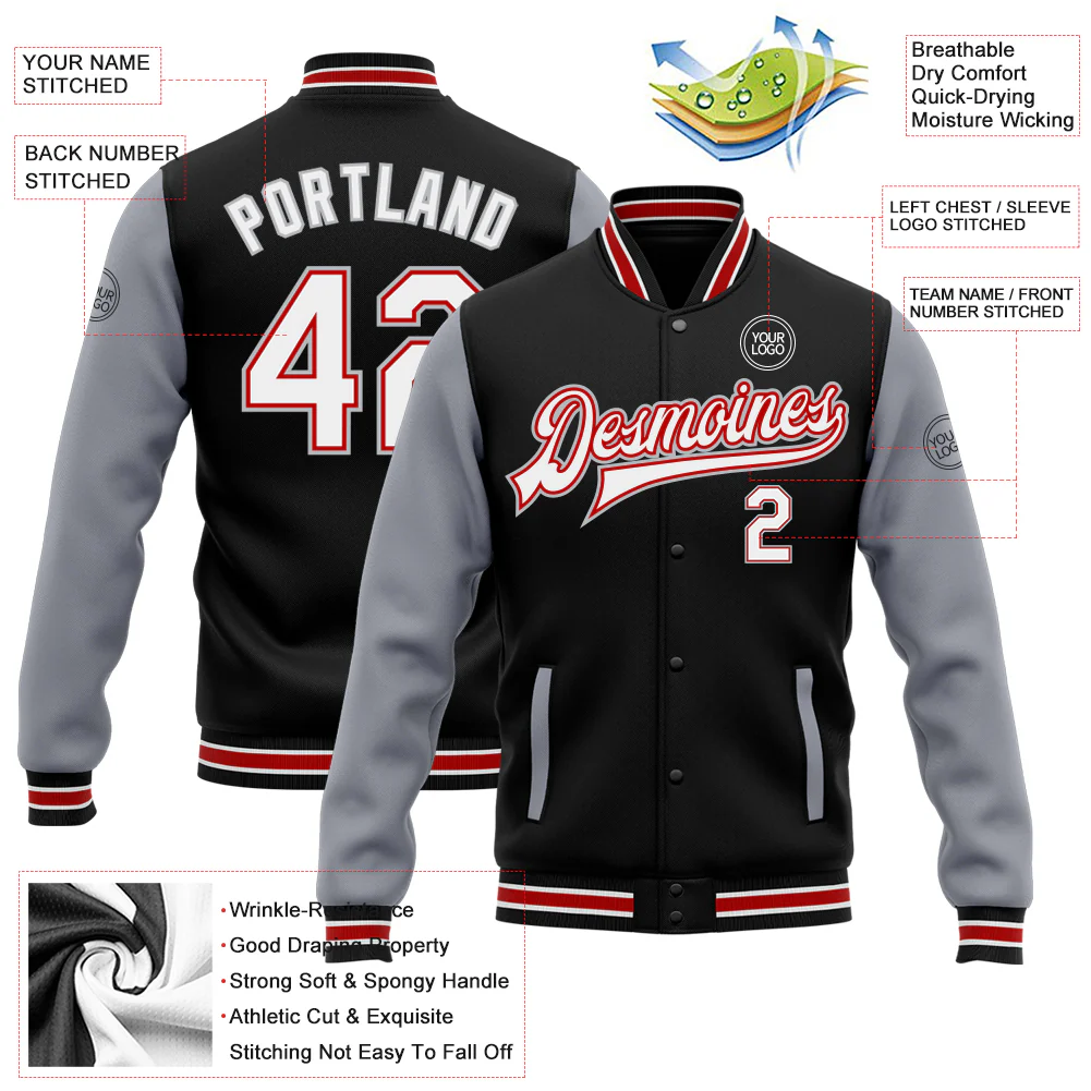 Custom Black White Red-Gray Bomber Full-Snap Varsity Letterman Two Tone Jacket