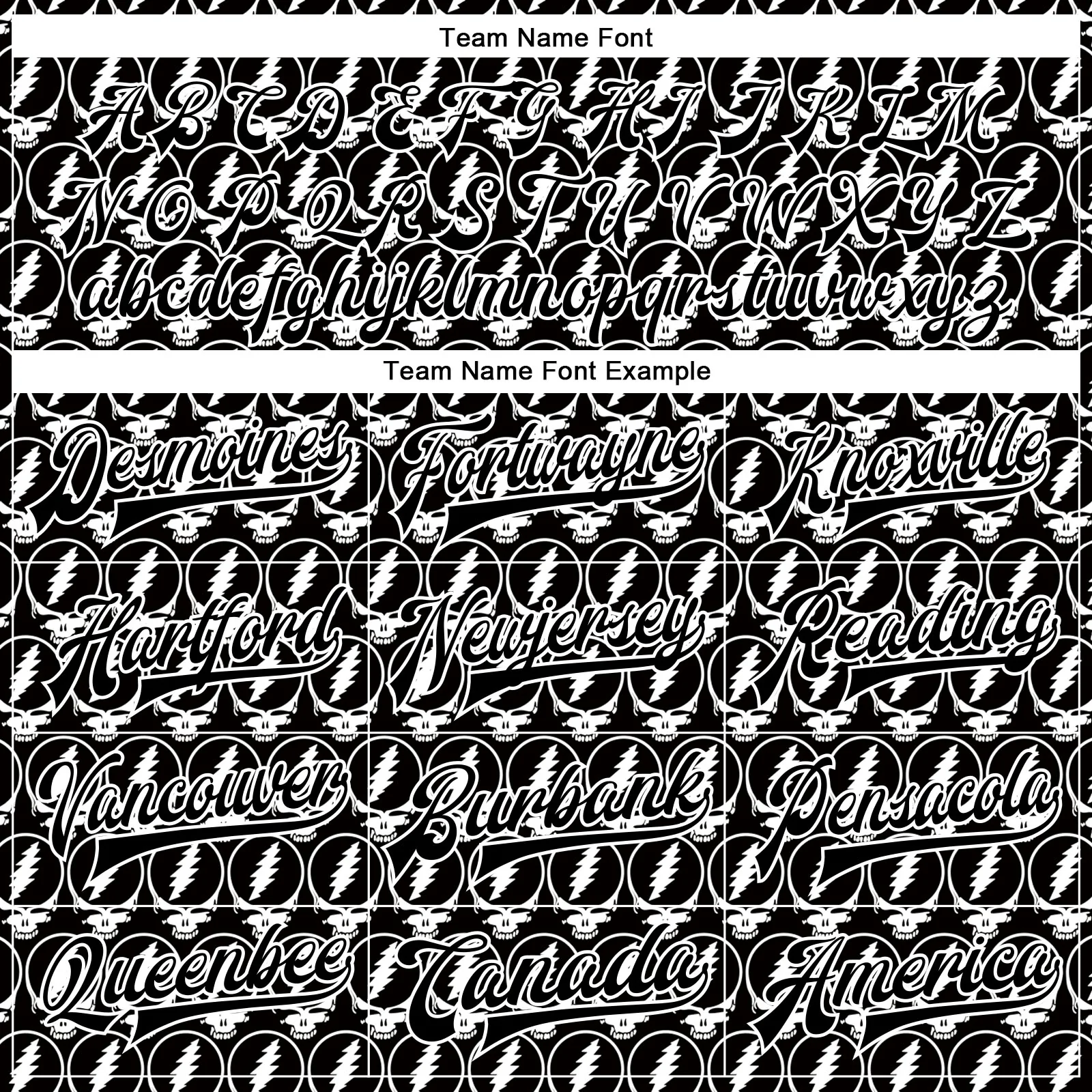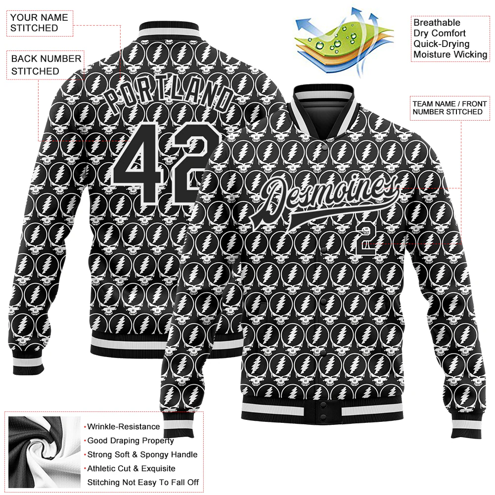 Custom Black White Lightning Skull Fashion 3D Bomber Full-Snap Varsity Letterman Jacket