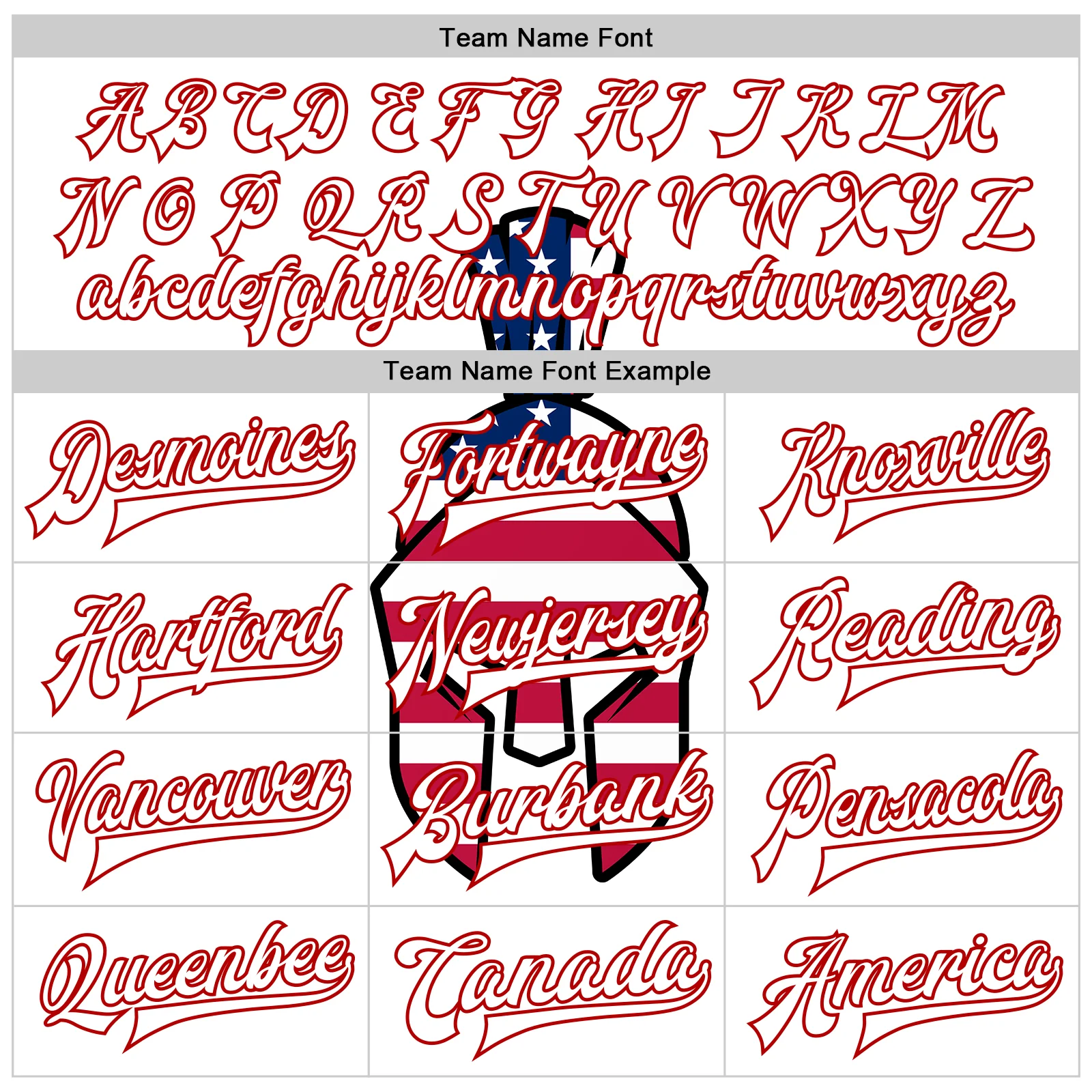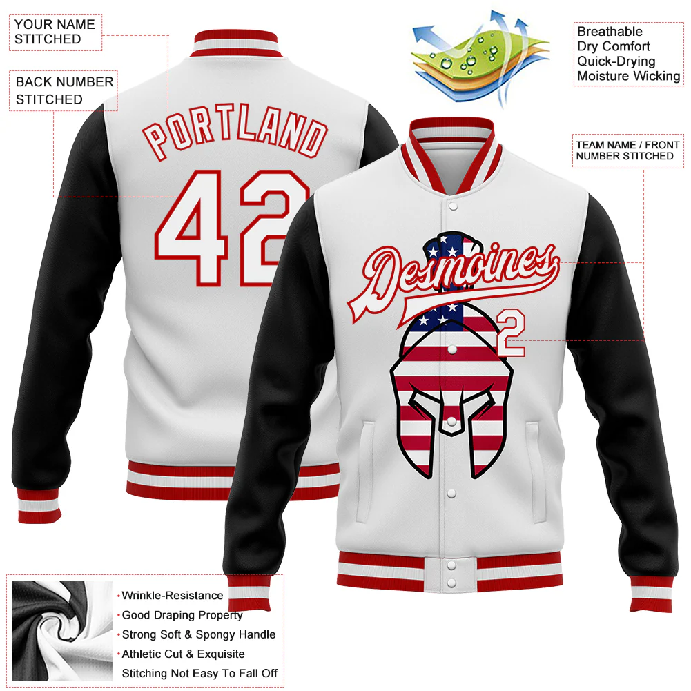 Custom White Red-Black Spartan Logo With USA Flag 3D Pattern Design Bomber Full-Snap Varsity Letterman Two Tone Jacket