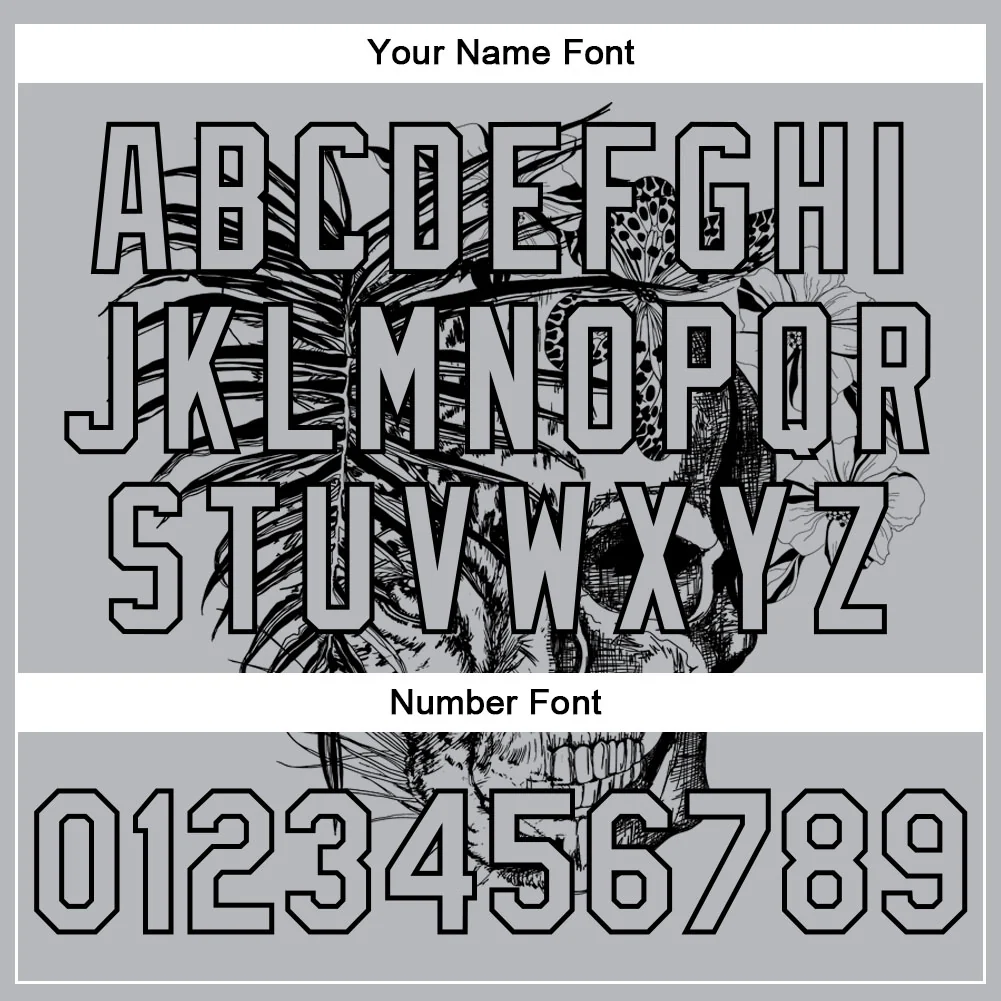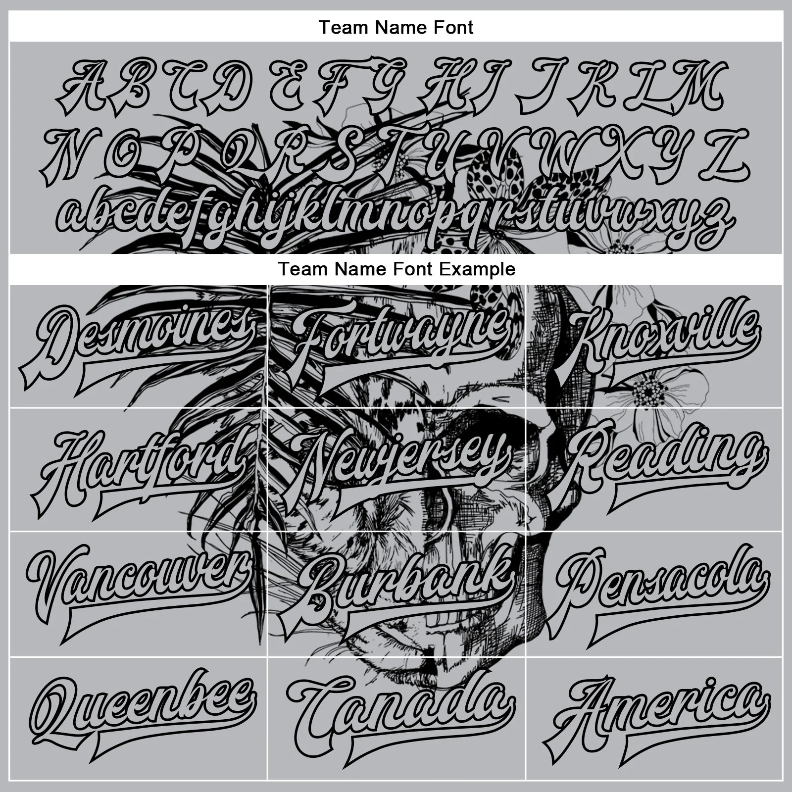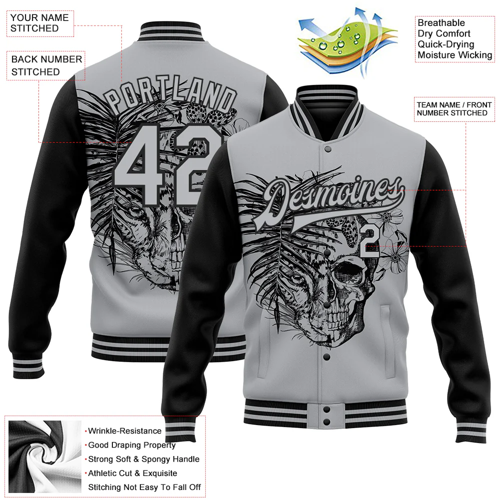 Custom Gray Black Tropical Plant Leopard Skull Fashion 3D Bomber Full-Snap Varsity Letterman Two Tone Jacket